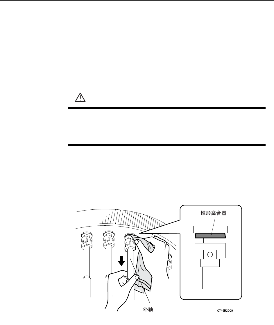 将各吸嘴旋转轴的外轴向下拉,同时用沾有脱脂洗净剂的布擦洗锥形离合器,将其整个一圈
