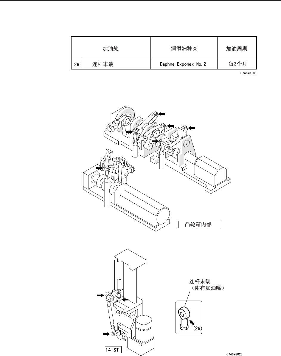 保养作业 >> 加 油 MEC-CP-842-1 .0S 5-31 5.2.1 1 各连杆末端的加油处 插图中的箭头表示加油处。特别 是黑箭头表示处必须用加油泵来加油 。