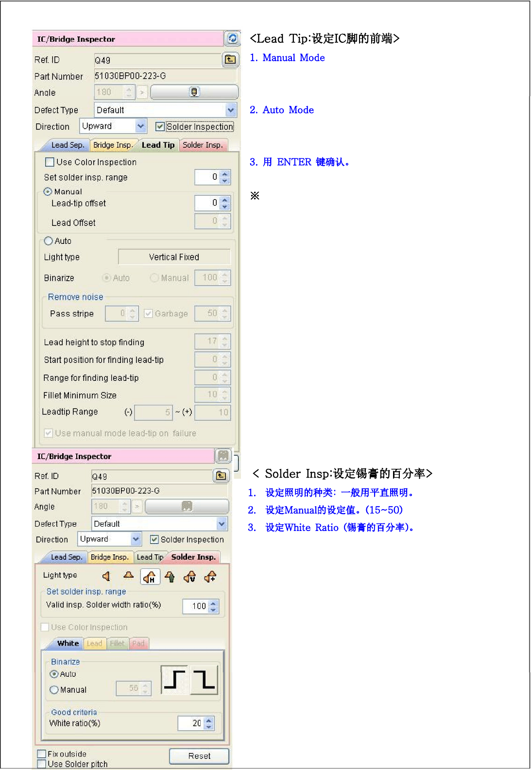 : 设定 IC 脚的方向 . ( 上下左右 ) 2-1) Light type: 设定照明的种类 : 优先选择水平灯光; 2-2) Binarize: 亮度设定(二值化设定) - 水平照明的时候 :60~100( 不一定 ) - 垂直照明的时候 :100~120( 不一定 ) - 选择 AUTO 的话 : 自动设定 : 可以改善影响 OR 删除 Flux 的影 像。 3-1) Pass Stripe ( 引脚宽度大小 ) - 可以改善 …