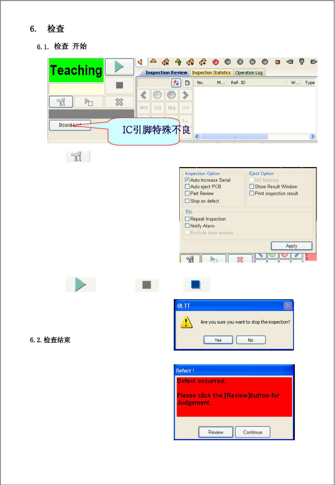 单击 图际 , 软件将会显示如图 1.0 的选项栏 . · AUTO INCREASE SERIAL 自动增加板号 · AUTO EJECT PCB 自动退出 PCB 板 · PART REVIEW 以零件不良个数显示 · STOP ON DEFECE 遇到不良检测停止 · SHOW RESULT WINDOW 输出结果窗口 · PRINT INSPECTION RESULT 打印检查结果 图 1.0 当击 进行检查 , 此时 将会变成…