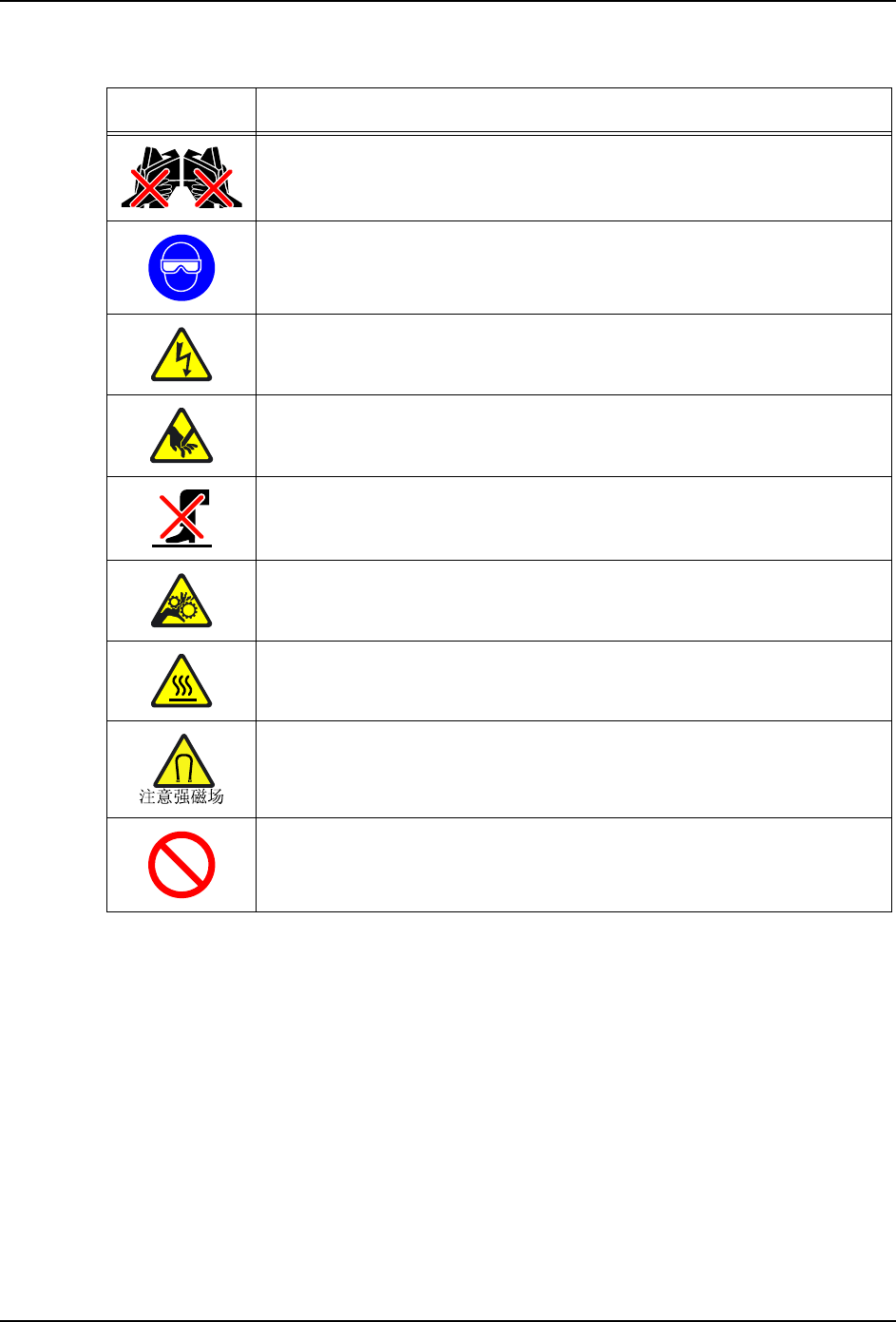 QD023-14 安全指南 NXT 安装手册 15 1.4.1 NXT 安全标记的含义 标记 含义 警告:注意被夹住。 请不要将手指放入相邻的模组。 义务的行为、指示:保护眼睛 ·因为照明装置的光线比较强 烈,请不要直视机器。有必要直视时 请戴好 太阳眼镜等保护眼睛的保护用具。 注意、警告:小心触电 *1:小心高压电、触电。请 切断电源后进行维修保养。 *2:一次电压请 从 AV200V 到 230V ± 10% 5 0/60Hz 之间…