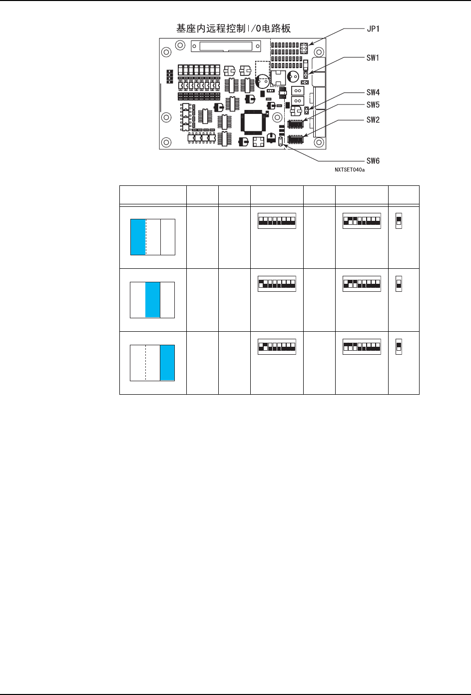 请按照以下设定基座内的接口电路板和远程控制 I/O 电路板上的跨接开关及双列直插开关。