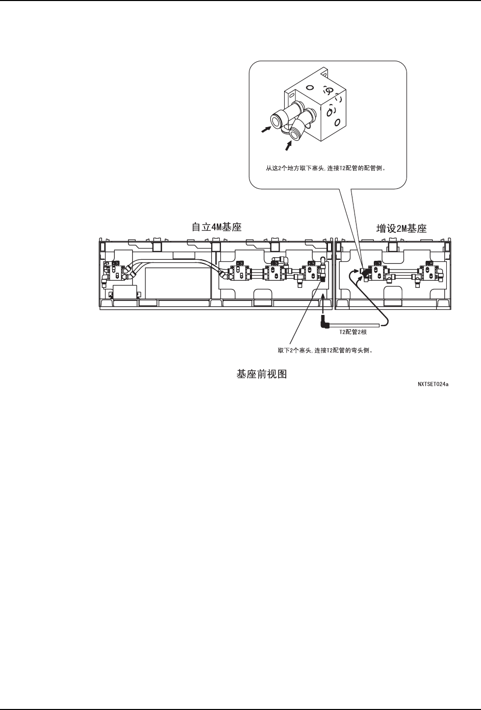 QD023-14 3. 机器的安装 NXT 安装手册 77 <在序列号为 295 以后的自立 4M 基座旁增设时> 基座的连接 完成信号电缆的连接及气源管的 配管后,用专用支架连接相邻基座 。请参照 " 3.3.3 基座 的连接 "。