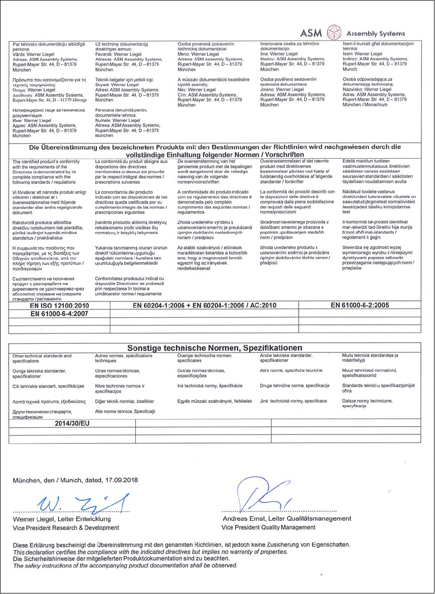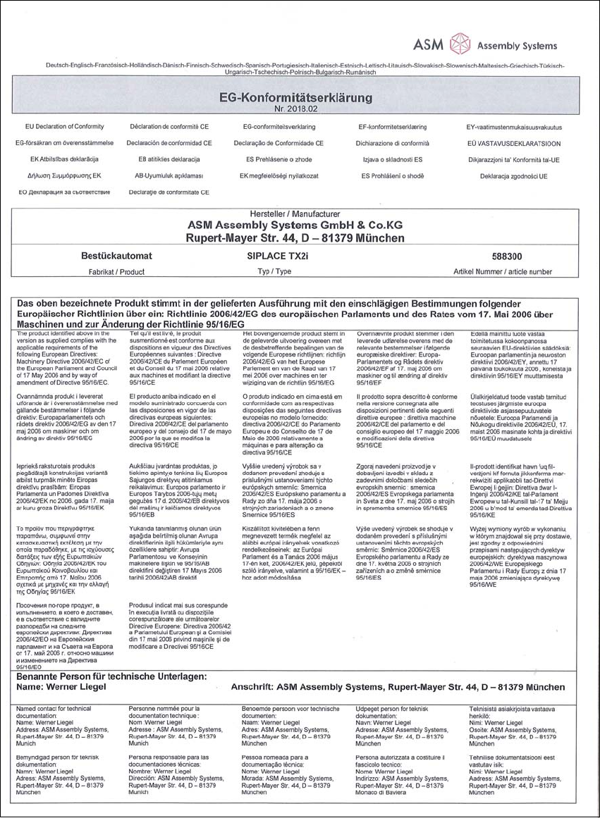 8 Załącznik Instrukcja eksploatacji SIPLACE TX 8.1 Deklaracje zgodności typu WE Od wersji oprogramowania 714.0 12/2020 318 8.1.3 SIPLACE TX2i (588300) 8 Rys. 8.1 - 5 SIPLACE TX2i (588300) – strona 1
