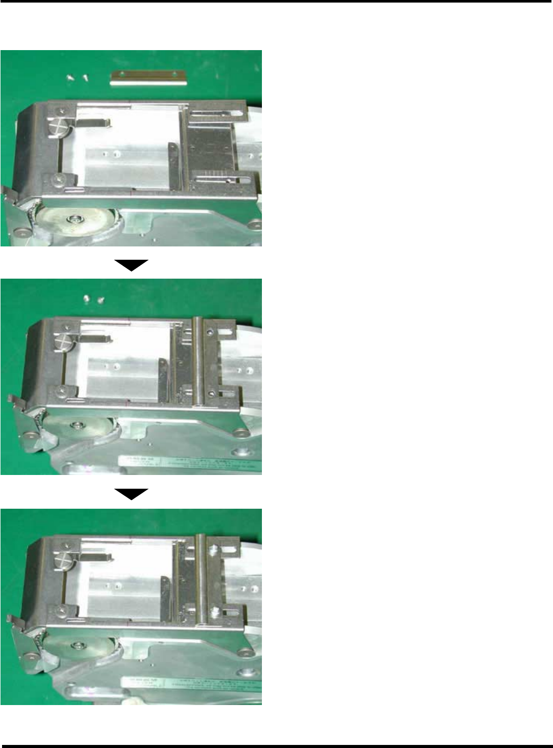 I ntelligent T ape Feeder 操作手册 7.1 关于故障 Page 7-22 B) 附带分离狭缝的进给间距变更板的安装 1. 安装附带分离狭缝的进给间距变更板。 2. 安装编带导轨。 3. 拧紧固定螺钉。 INT F-C-O MB07-A01- 00 IN T F-096P IN T F-097P IN T F-098P