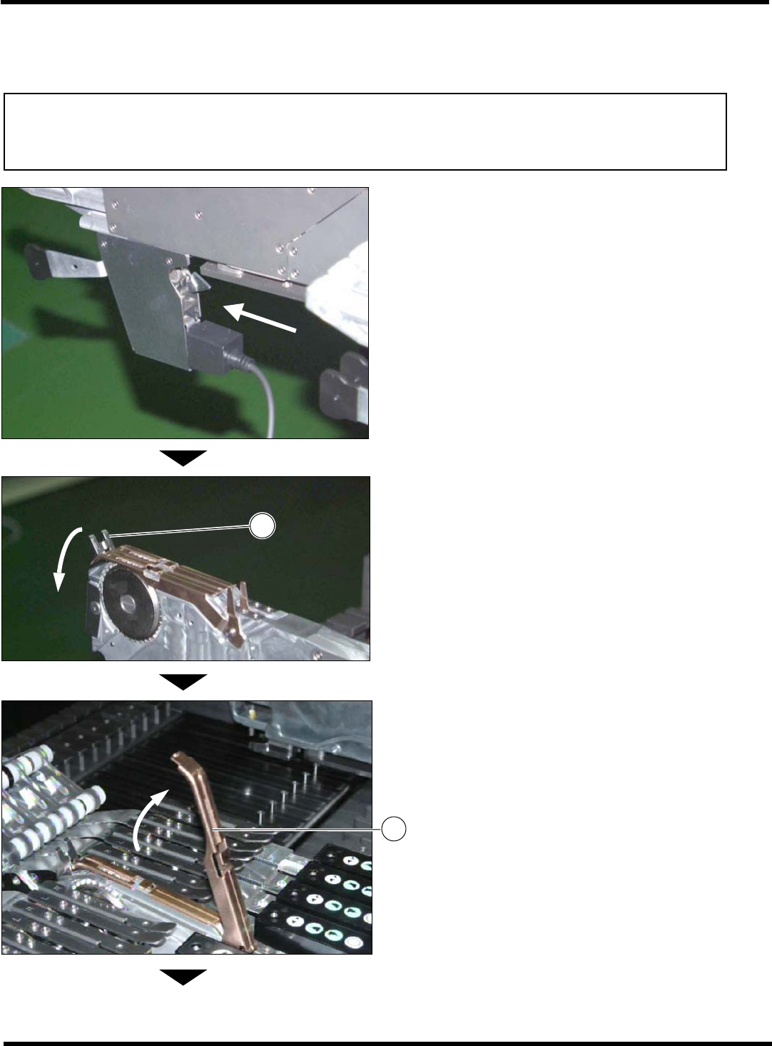 Intelligent Tape Feeder 操作手册 2.2 编带的设置 Page 2-9 4. 把载体编带经过编带插入口一直送到压盖 处。 ∗ 请务必剥去辅助编带。粘着剂容易粘 在齿轮, 滚轮上,有可能引起故障。 ∗ 请保留 50 mm 以上的空袋部分。 ∗ 请将压紧胶带尖端的 300 mm 左右部分向载体 编带的下侧方向折弯。 ( 使用带有接头检测传感器的供料器时 ) 在带有接头检测传感器的供料器上, 也必须使编带通过传感部位。…