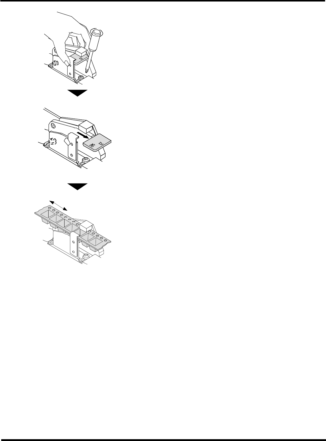 I ntelligent T ape Feeder 操作手册 5.2 编带导轨 ( 接头检测传感器部 ) Page 5-11 5.2. 2 使用量规的调整方法 使用量规的调整方法 使用量规的调整方法 使用量规的调整方法 是对照每一个编带的宽度使用量规进行调整的方法。 1. 用精密螺丝刀拧开调整螺钉 (M2.5) 。 2. 夹住量规使接头检测传感器和编带导轨的 宽度一致。 ∗ 此处,以 12 m m/ 16 mm 用的编带供料器为例 …