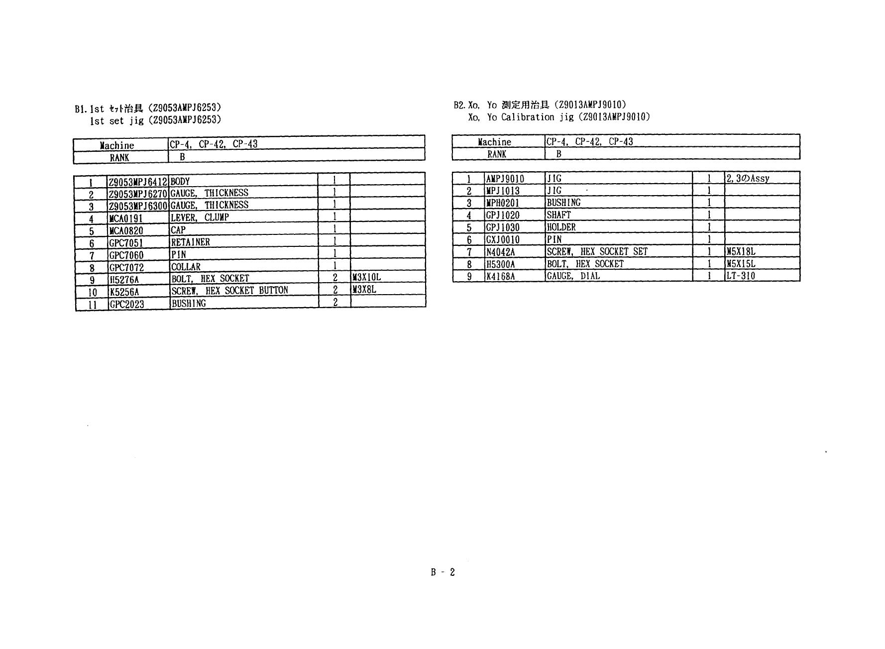 B 2 . Xo , Yo 測定用治具 ( Z 9013 AHPJ 9010 ) Xo , Yo Calibration jig ( Z 9013 AHPJ 9010 ) Bl . 1 st 治具 ( Z 9053 ABPJ 6253 ) 1 st set jig ( Z 9053 AMPJ 6253 ) Machine CP - 4 , CP - 42 , CP - 43 CP - 4 , CP - 42 , CP - 43 Mach…