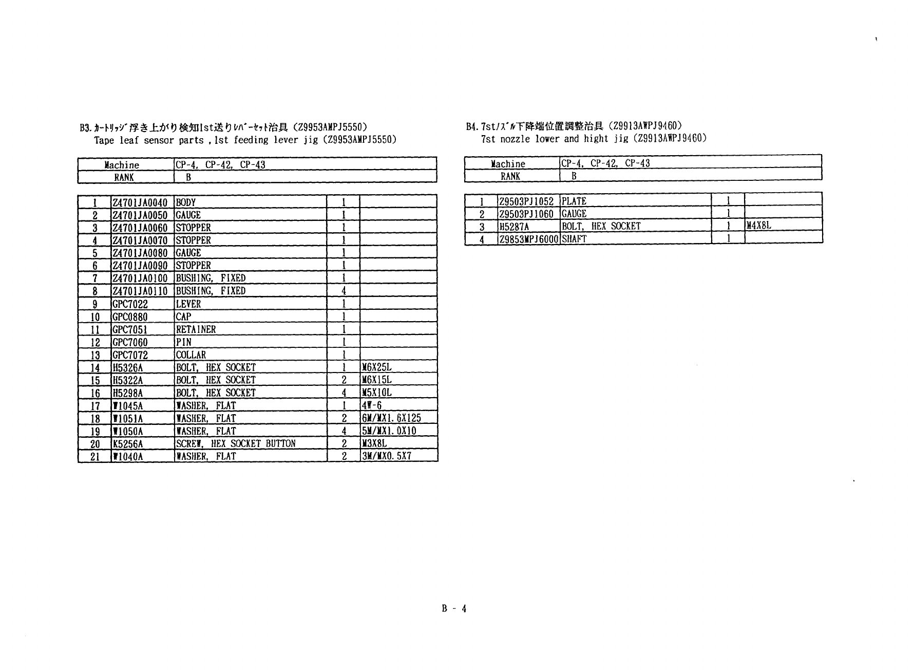 6.5 41.4 2 30 14 15 I 14 BB . lOst parts eject calibration iig ( Z 9013 AMPJ 9060 ) B 5 . Nozzle pick - up position calibration jig ( Z 9853 AMPJ 7130 ) CP - 4 . CP - 42 . CP - ^ I 3 Machine CP - 4 CP - 42 . CP - 43 Mach…