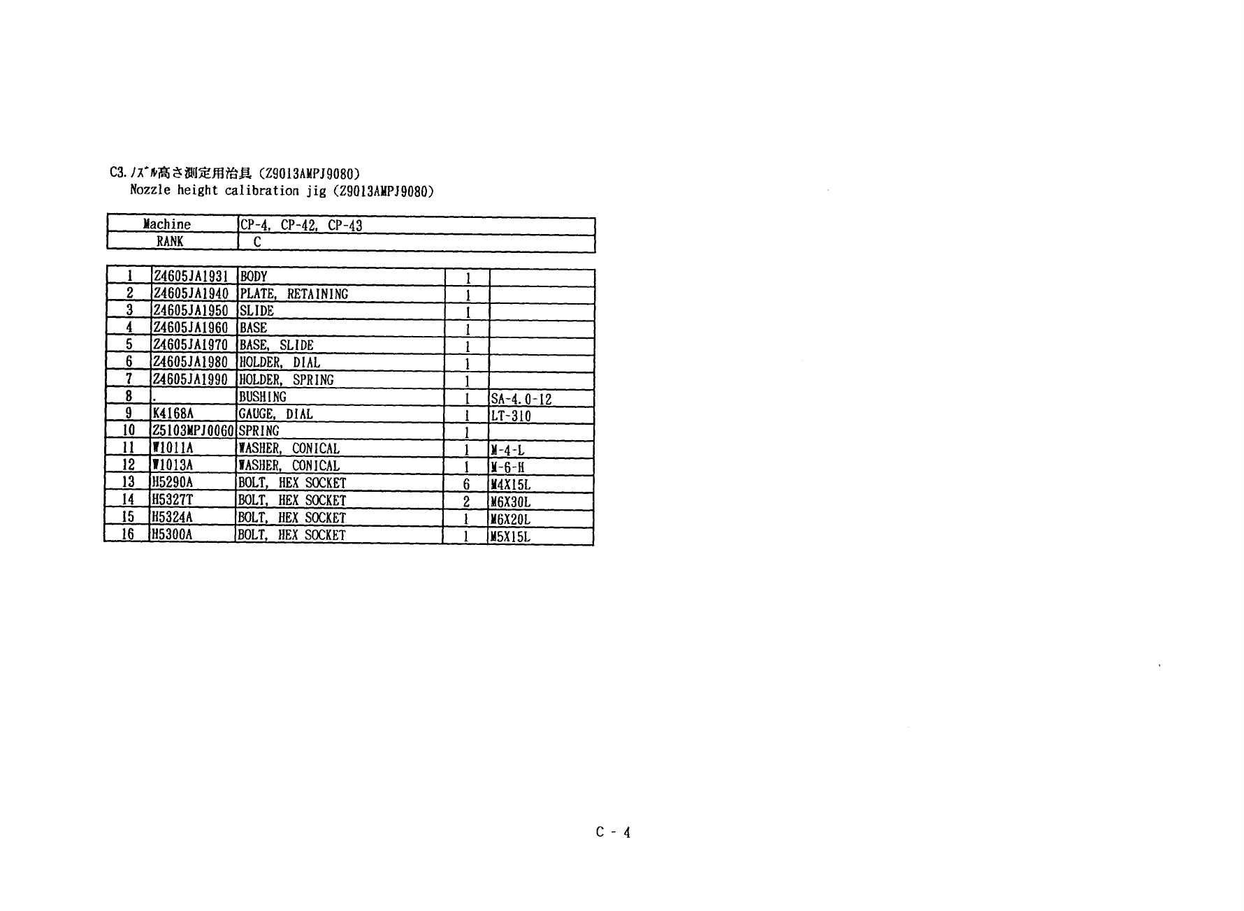 C 3 . / r 办高 $ 測定用治具 ( Z 9013 AHPJ 9080 ) Nozzle height calibration jig ( Z 9013 AHPJ 9080 ) Machine CP - 4 , CP - 42 , CP - 43 RANK C Z 4605 JA 1931 BODY 2 Z 4605 JA 1940 PLATE , RETAINING 3 Z 4605 JA 1950 SLIDE 4 Z 460…