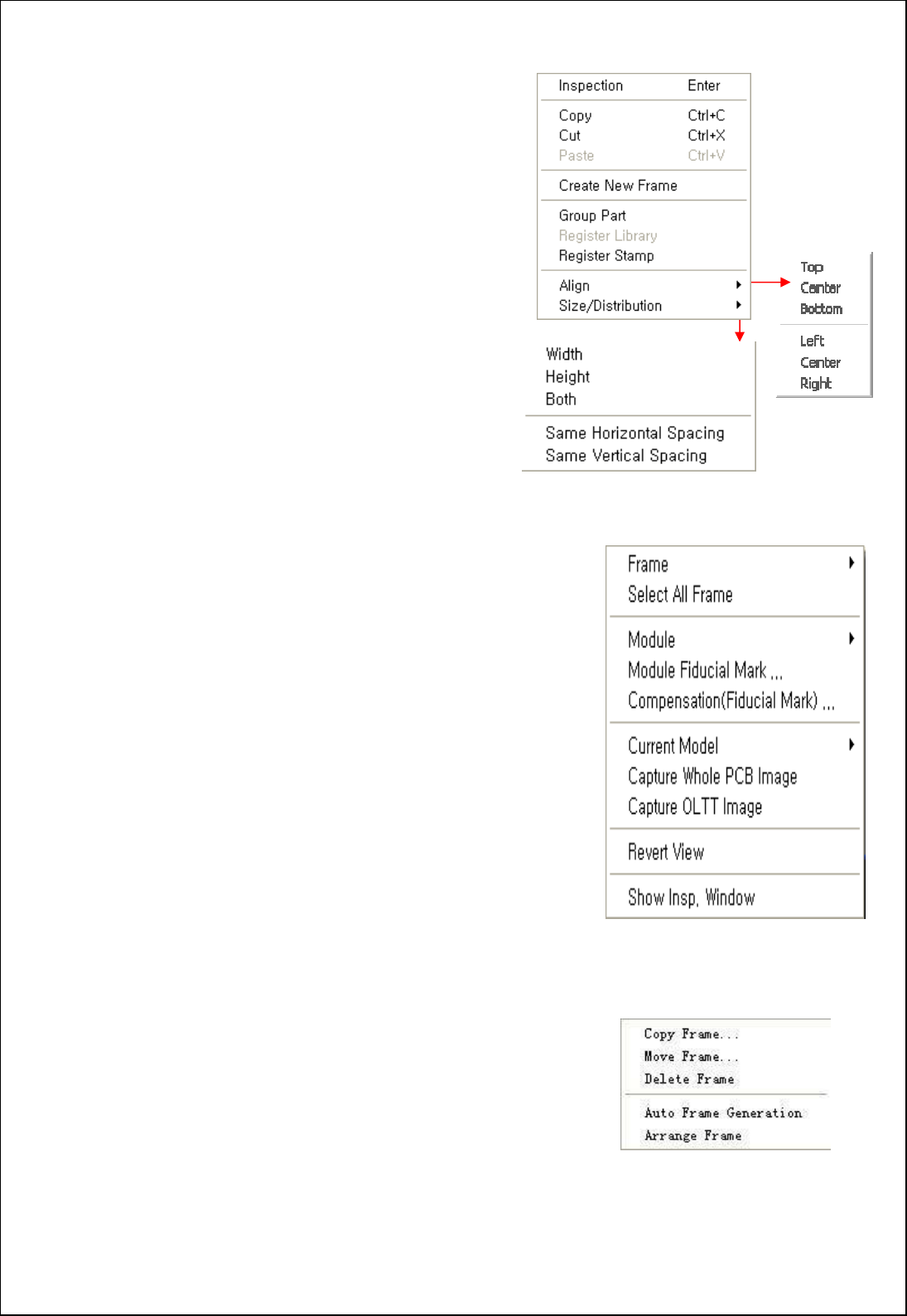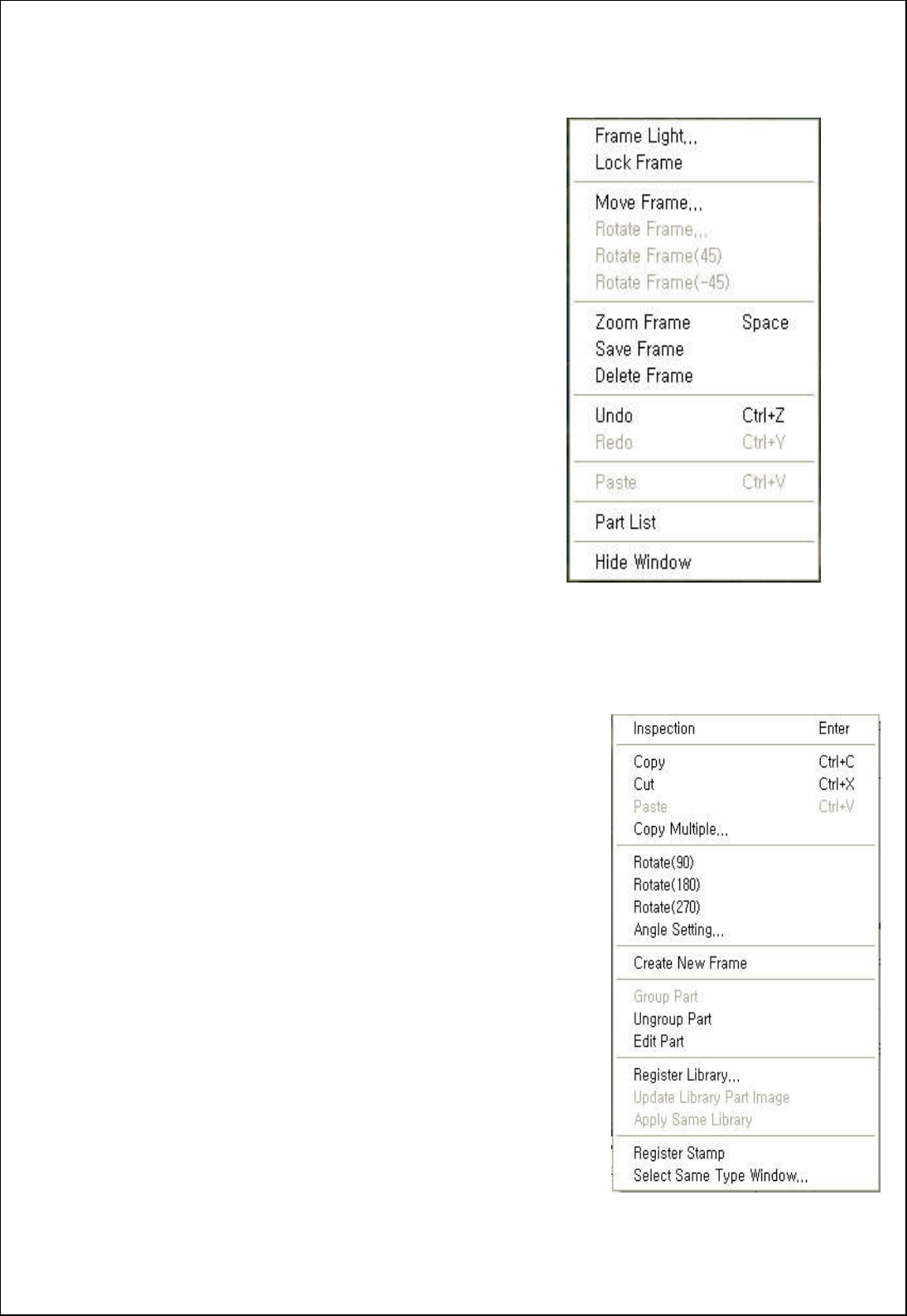 31 5.鼠标右键 的基本用法 5.1 PO P-UP MENU 说明 (按鼠 标的右边时的画面 ) 5.1.1 Frame View的POP-UP MENU ◆ Frame Light : 在一个Frame内选择用户照明。 ◆ Lock Frame : 实行 Frame Gen eration时,选择的fr ame 不受到 Frame Genera tion。 ◆ Move Frame :移动现在的Fr ame位置。 ◆ Rotate…