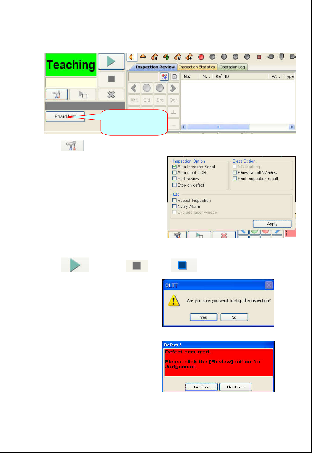 34 6. 检查 6.1. 检查 开始 单击 图际,软件将会显示如 图 1.0 的选项栏. ·AUTO IN CREASE SERIA L 自动增加板号 ·AUTO EJ ECT PCB 自动退出 PCB 板 ·PART RE VIEW 以零件不良个数显示 ·STOP ON DEFECE 遇到不良检测停 止 ·SHOW RE SULT WINDOW 输出结果窗口 ·PRINT I NSPECTION RE SULT 打印检查结果 图 1…