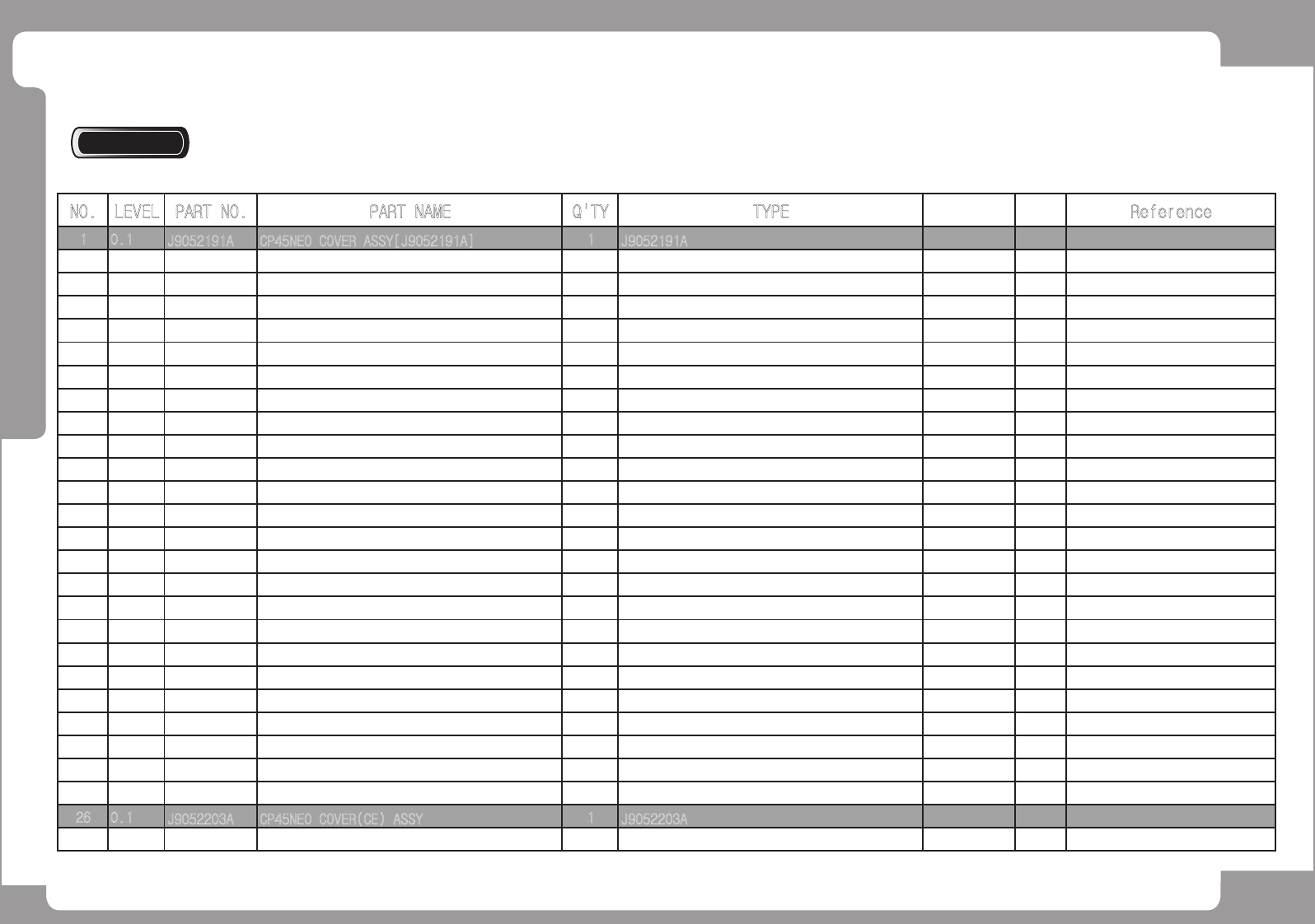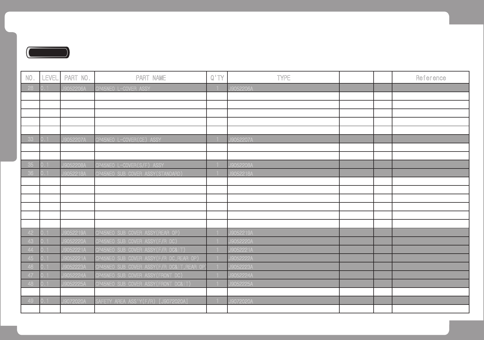 Part List SAMSUNG TECHWIN Page 85 CP45NEO C over Ass’y NO. LEVEL PART NO. PART NAME Q'TY TYPE Old No . Stock Reference 28 0.1 J9052206A CP45NEO L-COVER ASSY 1 J9052206A 29 ...3 J7070093B COVER-L.F.U-LARGE 1 J7070093…