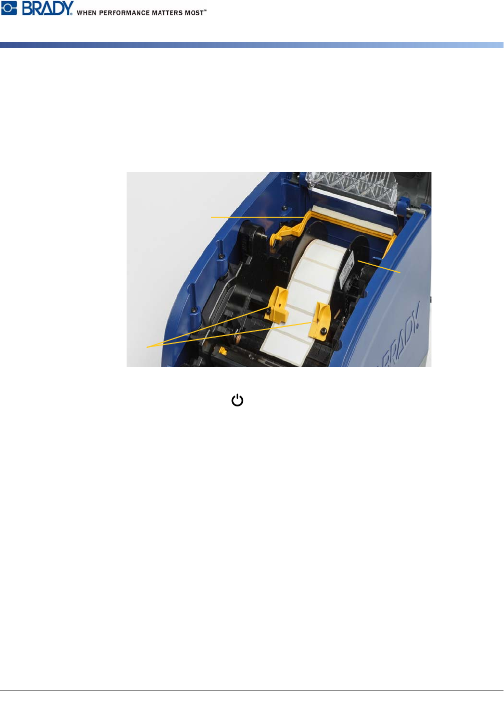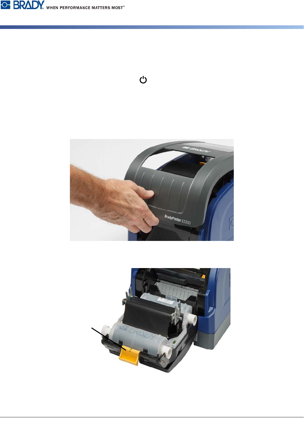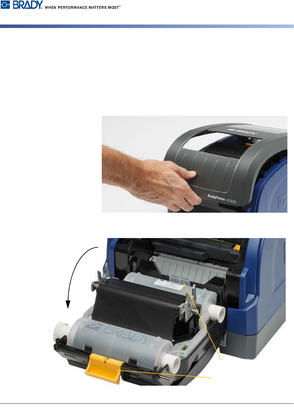BradyPrinter i3300 8 安装 安装或更换耗材 4. 将装有色带的色带盒放在 打印头上(产品标签朝机器方向),然后使其卡 入到位。 5. 清洁并锁定打印头门。 6. 关闭外壳盖。 7. 如果打印机处于休眠状态 ,则按 。系统将检测安装的耗材 ,设置标签和色带颜色,显示标签 尺寸和剩余耗材量。 安装或更换耗材 1. 打开外壳盖。 2. 松开打印头门上的锁 [2 ] 并晃动将其打开。 3. 将黄色耗材刮臂 [3] 摇到背面,…