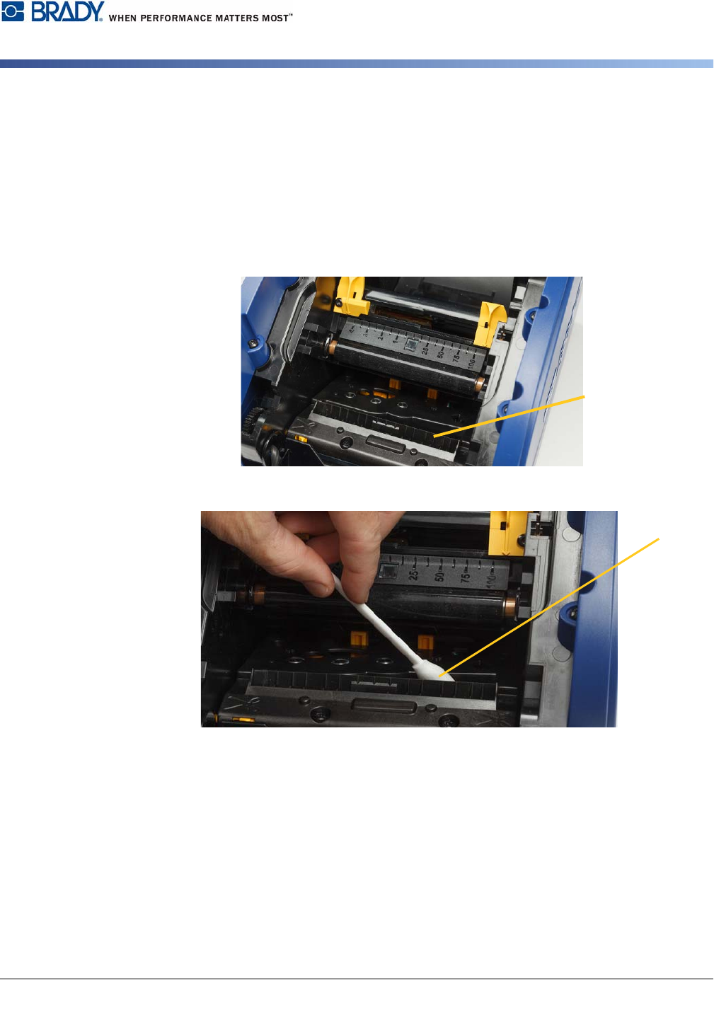 BradyPrinter i3300 29 维护 清洁打印机 4. 清洁金属切刀刀片 [9] : a. 如果切刀刀片上残留物很 多,使用清洁工具包中切刀清洁工具轻轻地刮掉切 刀刀片 上的残留物。 b. 使用异丙醇浸湿清洁工具 包中的一个发泡棉签。请勿使异丙醇从棉签上滴落 。 c. 使用浸湿的棉签清洁切刀刀片直到除 掉所有的残留物。 d. 使用浸湿的棉签清洁刀片 结构边缘的下方。为避免迫使残留物进入机器更深 处,请 从刀片外边缘向中心做擦…