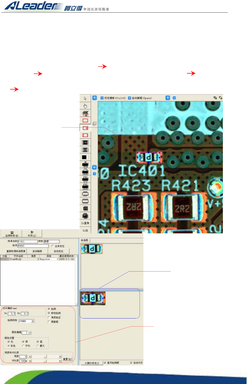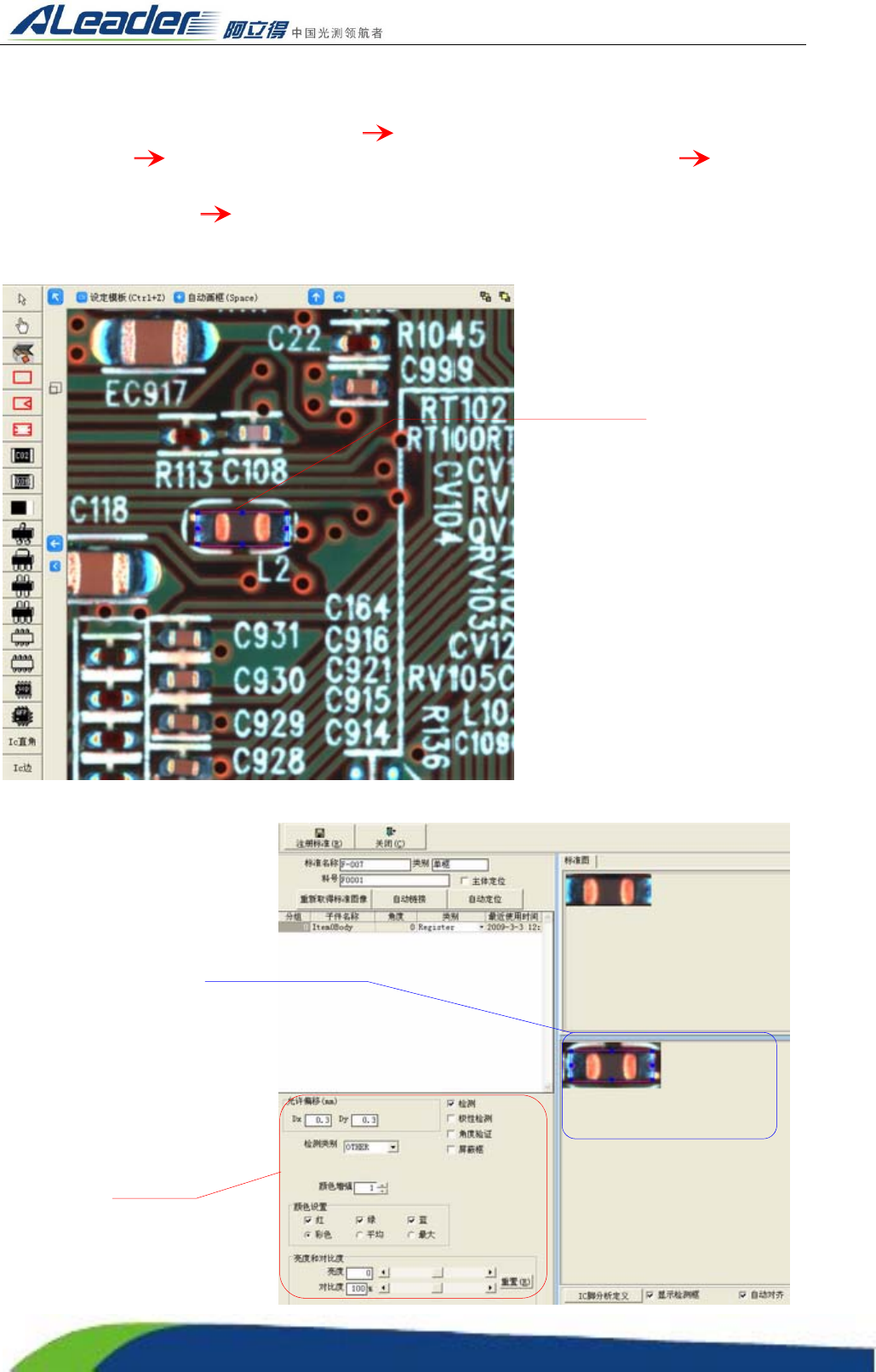 Http:www.aoichina.c om TEL:0769-22620377 2262 0877 FAX:0769-23102060 Page:26 of 10 3 3.3.7.1.1 单框 模块的注册 单框模块,一般针对锡点较少的元件,如 0603 以下不具有丝印的元件(不包括 0 603 元件) 的注册,选择左边的元件注册工具模块的单框 在编辑区域所看到的元件上鼠标左键平滑拉出注册 框包括整个元件 选择注册框鼠标右键选择注册标准…