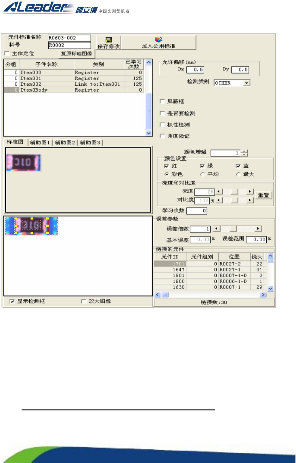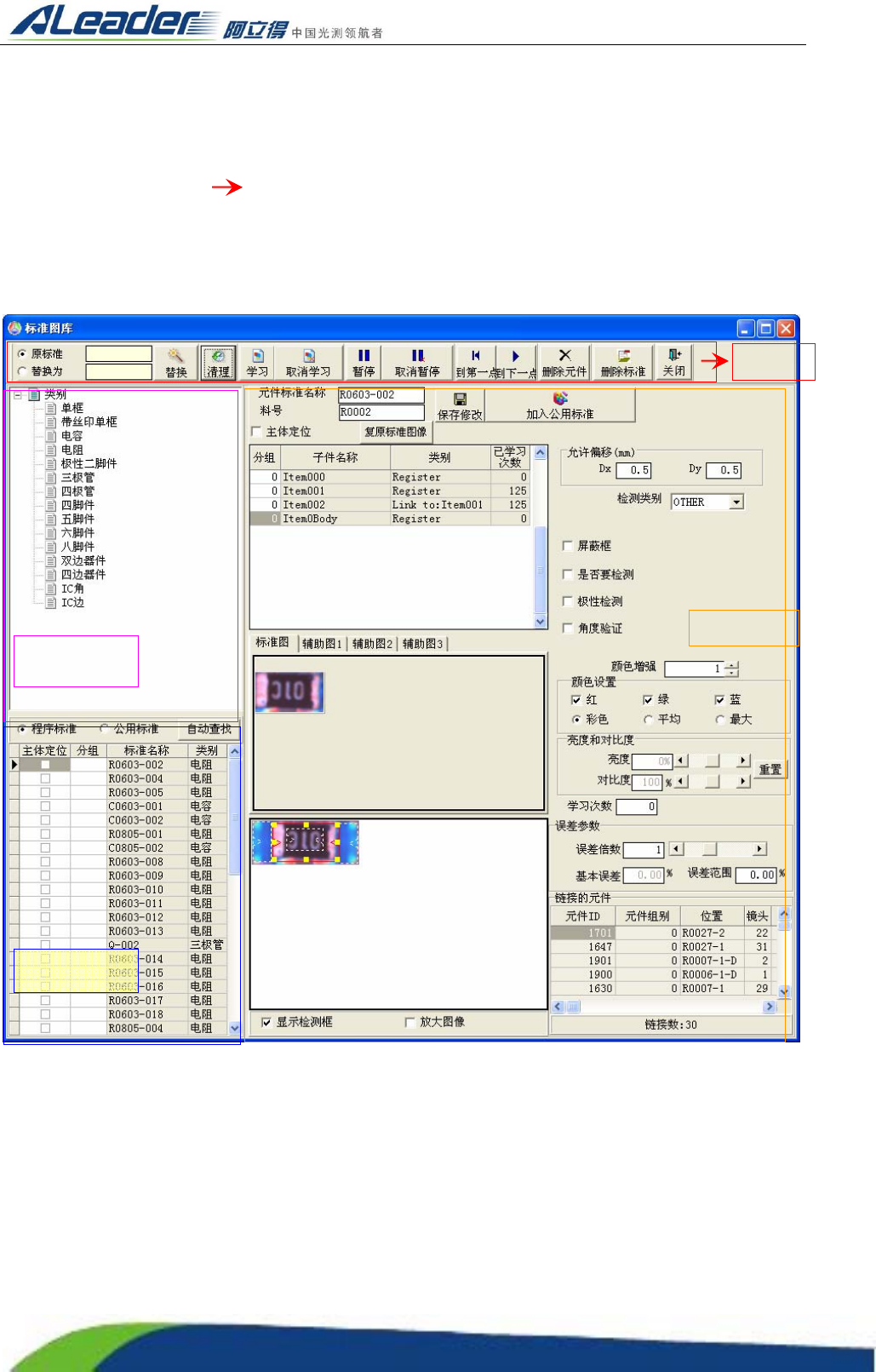Http:www.aoichina.c om TEL:0769-22620377 2262 0877 FAX:0769-23102060 Page:39 of 10 3 3.5.1 工具条 1 ) 清理:删除标准库中链接个数为零的元件标准图像。 2 )替换为:把某一标准图像替换成另一标准标准图像。 3 )学习:指定某元件标准进行测试单个学习 4 )取消学习:取消某元件标准图像的学习。 5 )暂停:指定某元件标准进行测试暂停。 6 )取消…
