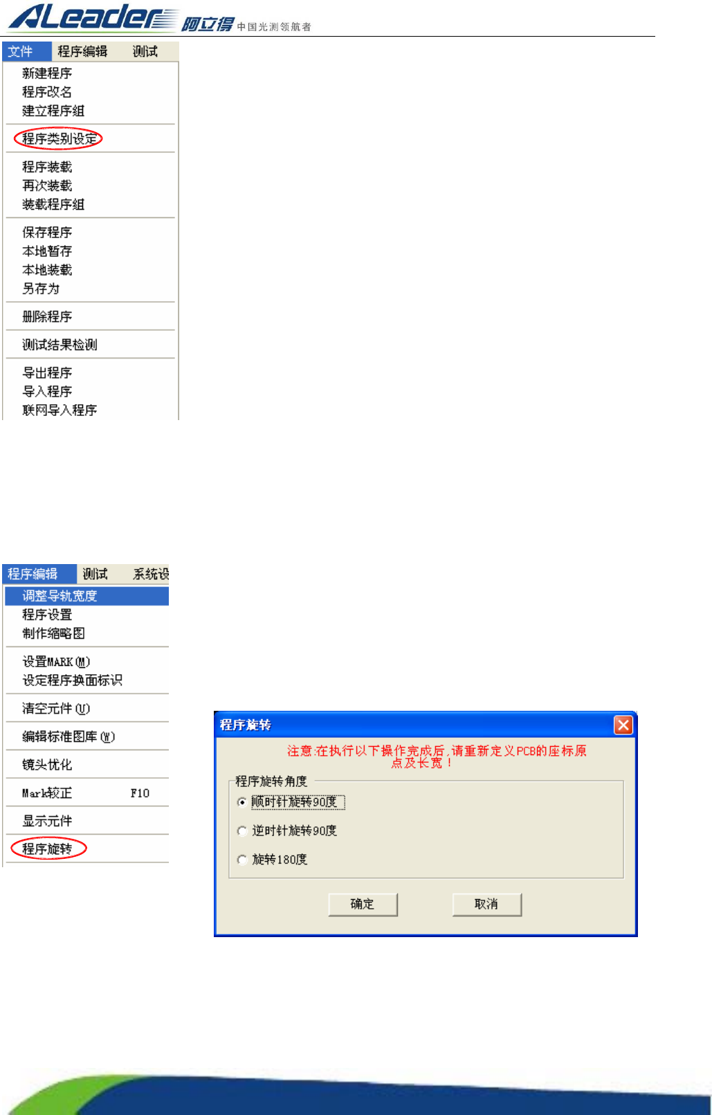 Http:www.aoichina.c om TEL:0769-22620377 2262 0877 FAX:0769-23102060 Page:60 of 10 3 3.19 程序旋转 在具体的操作过程中,由于 PCB 板的放置角度发生了改变,原来的程序将不能直接应用,而通过程序 旋转命令,可避免重新编程。 操作方法 : 选择主菜单“程序编辑”栏下“程序旋转”选项,打开程序旋 转窗口, 选择需旋转的 “角度” 确定, 然后重新 “调…