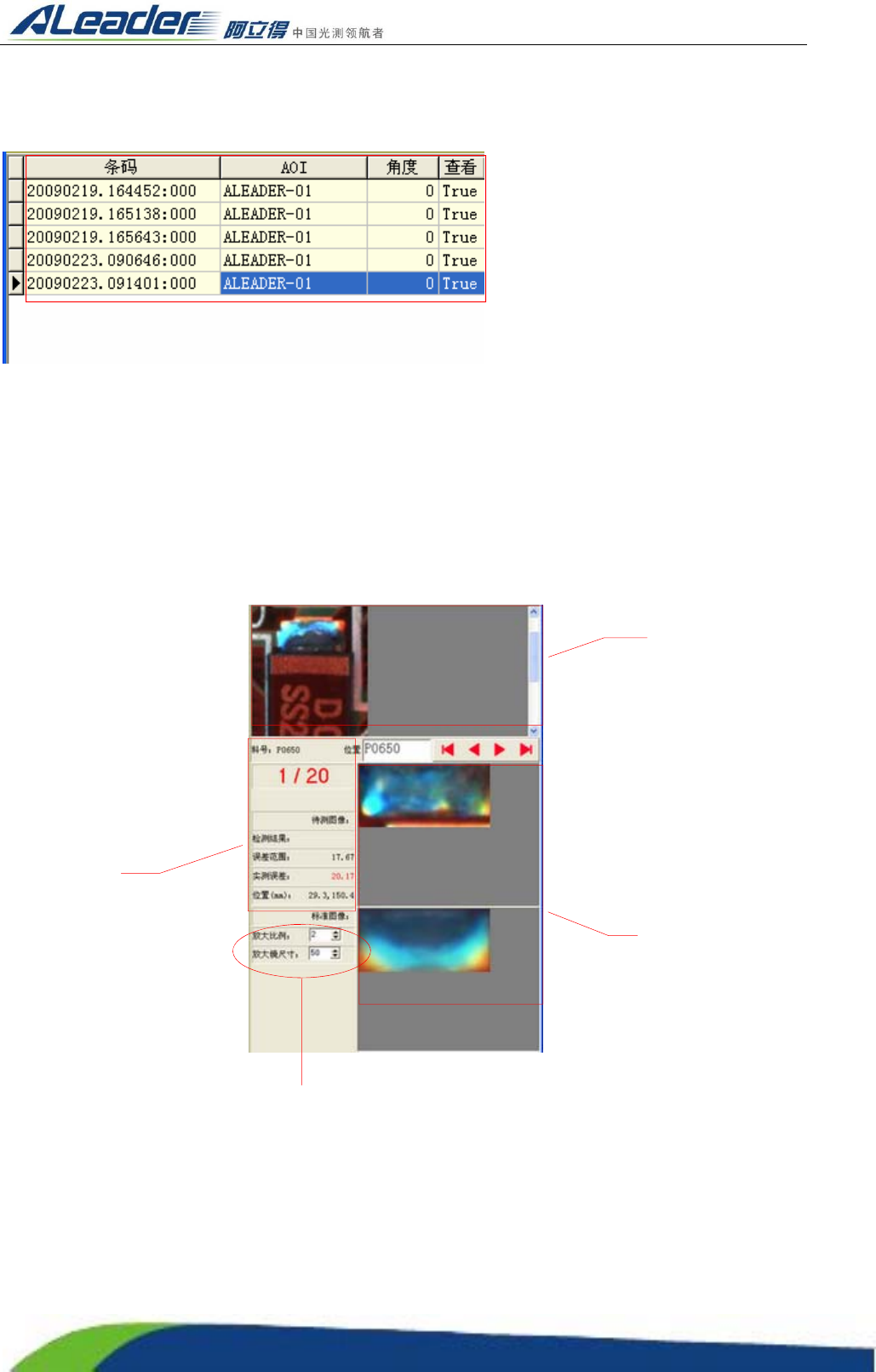 Http:www.aoichina.c om TEL:0769-22620377 2262 0877 FAX:0769-23102060 Page:93 of 10 3 NG 数据区 从该界面上可以很直观了解到每块板的 NG 详细信息, PCB 条码、 AOI 序号、查看状态。 当前 NG 图像比对区 NG 类型确认区 此位置显示标准图 , 如图 显示的是当前错误图片 的标准图 显示 NG 与标准 之间的误差值, 元件数量 :1/20 …
