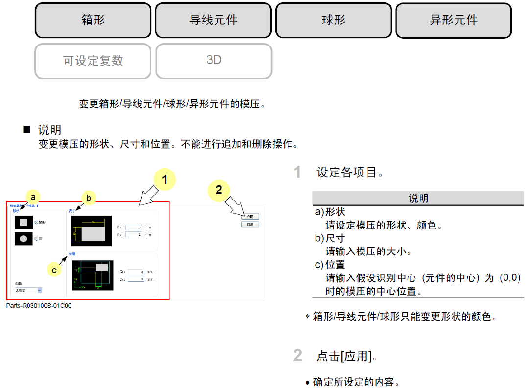 - 15 - 2)形状可选项设定方法 在形状可选项画面上,能补加 、编辑定义元件形状的可选项。 1 编辑现在已登录的形状可选项时,点击要编辑的可选项,然后点击 [ 编辑 ] 。 ∗ 补加新的形状可选项时,点击 [ 添加 ] ,选择项目。 ∗ 作为初始值登录的形状可选项不能进行编辑、 删除。 在初始值的形状可选项名开头处有 ‘ ∗ ’ 。 ( 只有模具 可编辑 ‘ 颜色 ’ 项目。 ) 2 编辑项目后,点击 [ 应用 ] 。 ∗ 重复进行…