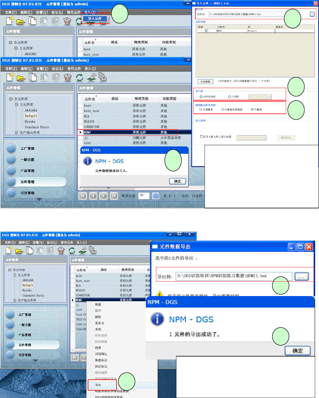 - 77 - 5) 部品资料库导入 6) 部品资料库导出 1 2 3 4 5 元件导入: 1 、选择元件导入 2 、选择元件资料存放路径 3 、选择导入到那个元件库中 4 、有相同部品时如何对应 5 、导入完成 1 元件导出: 1 、右键选中要导出的元件,点击导出 2 、选择元件的保存路径 3 、导出完成 3 2