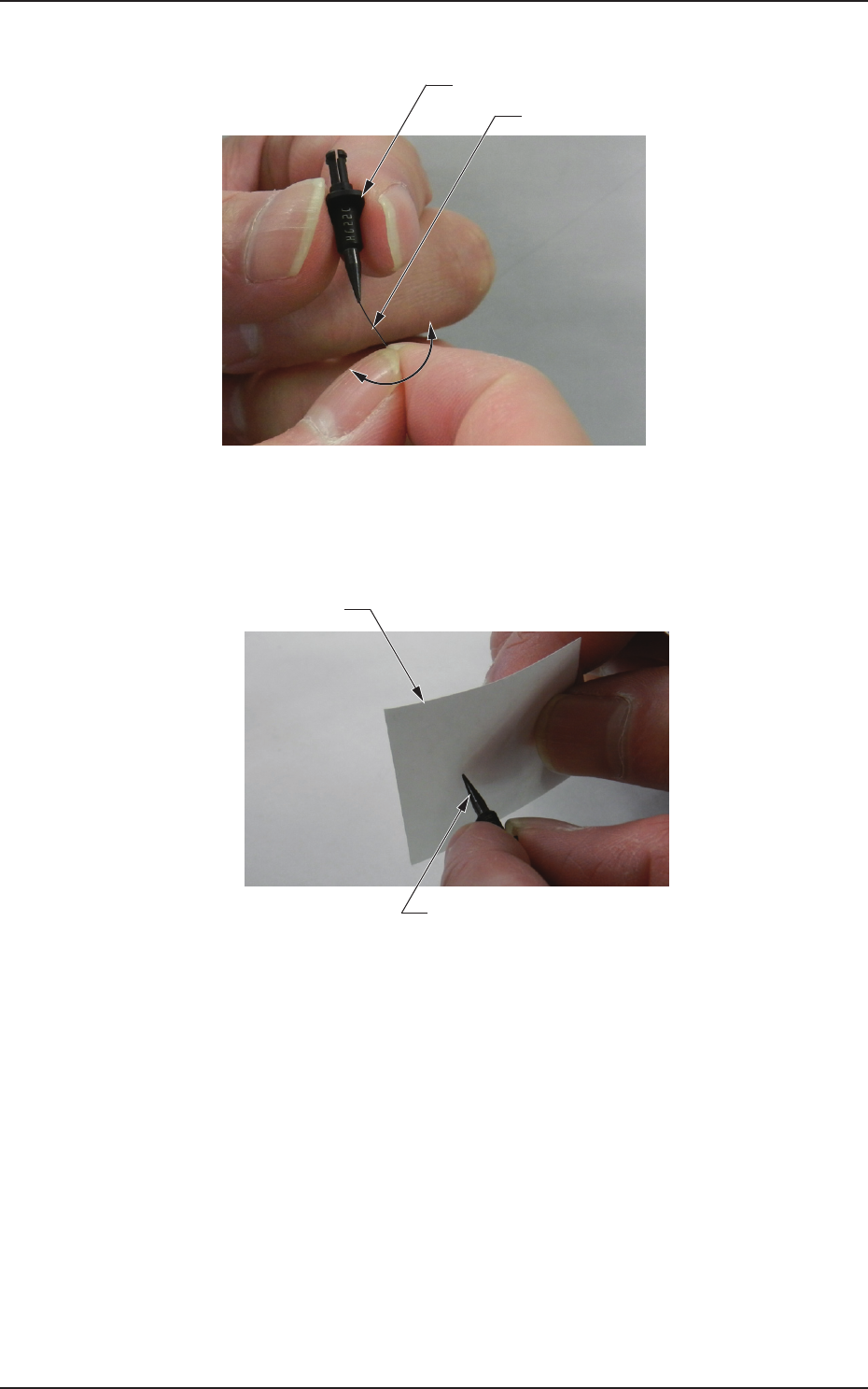 4OM-1752 1-61 • 使用吸嘴前端清扫治具时 准备为了从前端使用针规清扫 HG22C、HG33C 的治具。 针规 吸嘴 吸嘴前端清扫治具 F4A54 将吸嘴从前端侧插入到治具,推入到治具的状态下轻轻插入针规。 针规不好插入时不要强行插入,请多次上下重复。 1305-001 5.5利用针规清扫高速吸嘴孔部