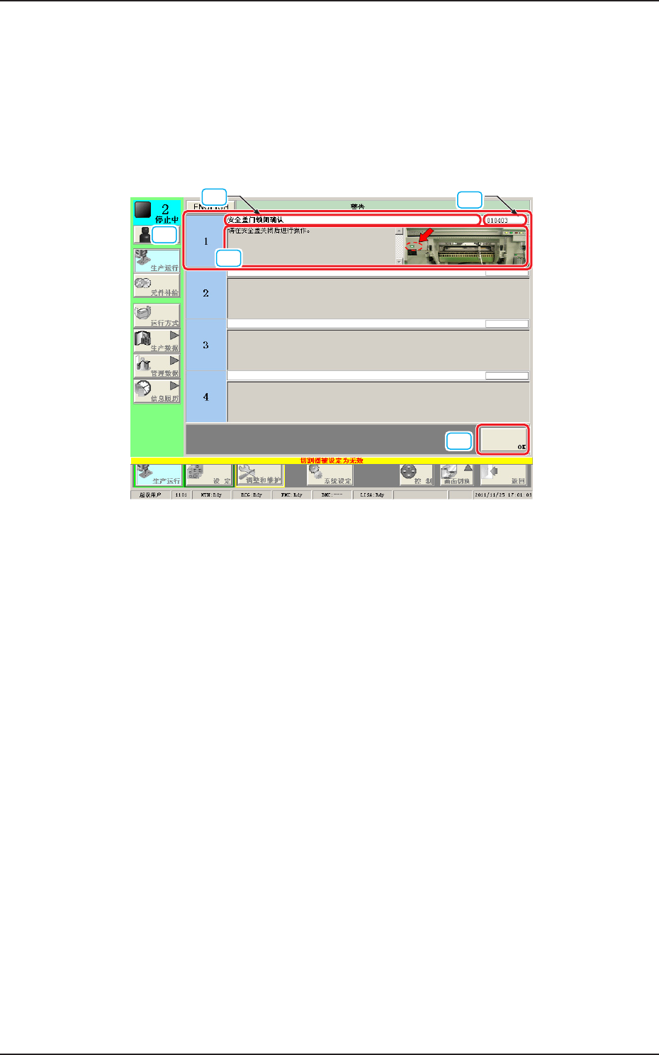 4OM-1752 2-2 1305-001 2. 警告 ( 启动向导 ) 2. 警告 ( 启动向导 ) 2.1 关于警告 ( 启动向导 ) 界面 在装置误操作或异常发生后没有正确复位时,显示如下警告 ( 启动向导 ) 界 面。 [1] [4] [3] [2] [5] 警告示例 F4B2 [1] 警告 显示警告。 [2] 启动向导编码 显示启动向导编码。 [3] 显示区分 A 显示警告的概要。 [4] 显示区分 B 显示警告的详细内容。 …