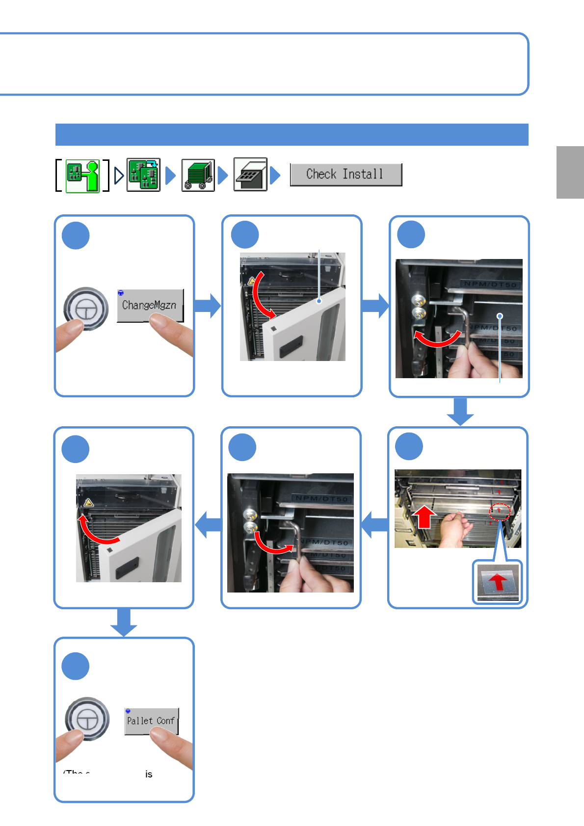 NPM-W 2 EJM7DE-MB-02 O-00 Setting the pallet to the magazine 2 6 5 3 4 Unlock the pallet Put the pallet in the magazine Lock the pallet ● If the door is locked ( → P.2-4-3) Magazine door Pallet ● Be careful with pallet o…
