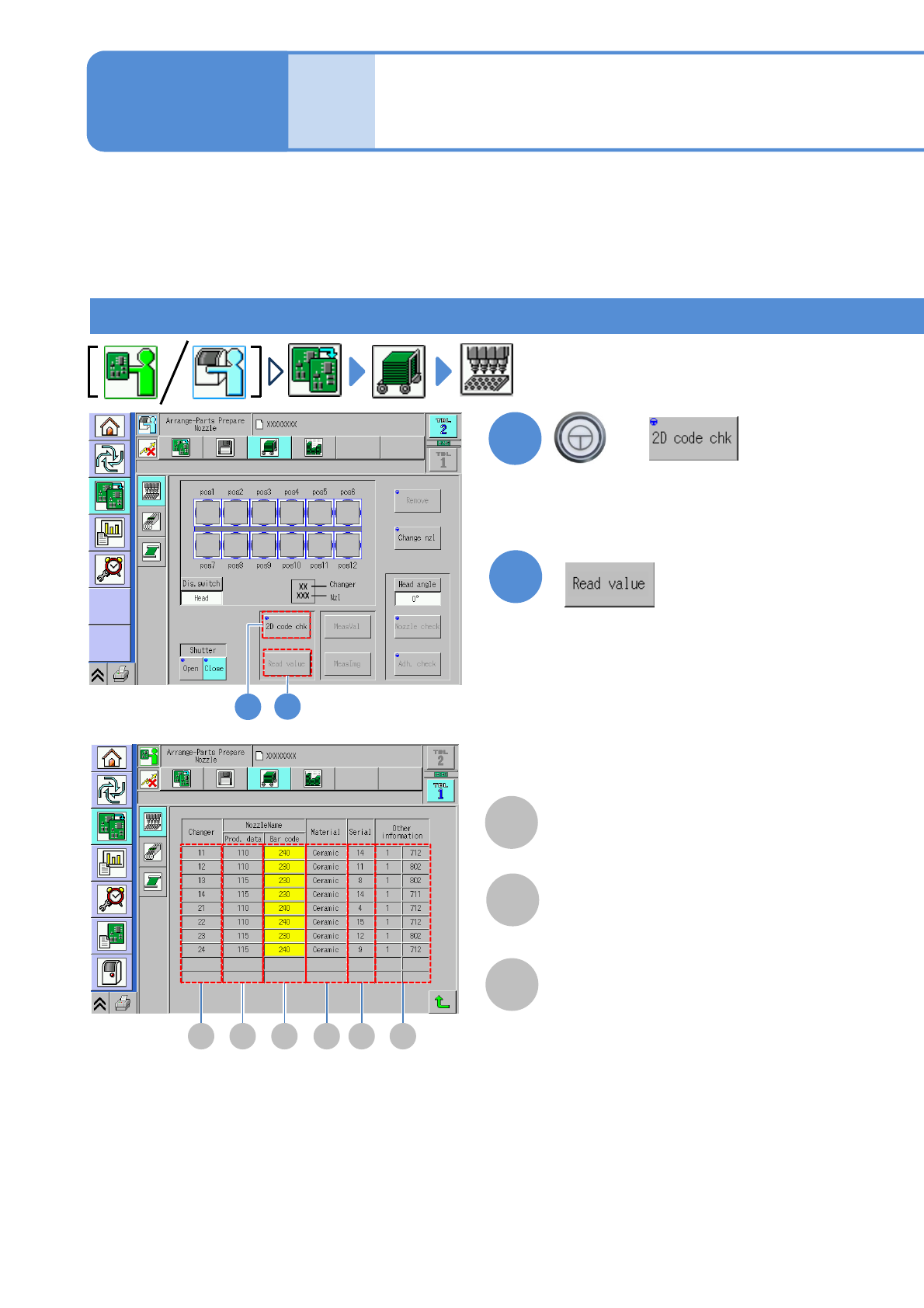 This is used to prevent miss setting of the nozzles. At the start of automatic operation, the nozzle 2D code