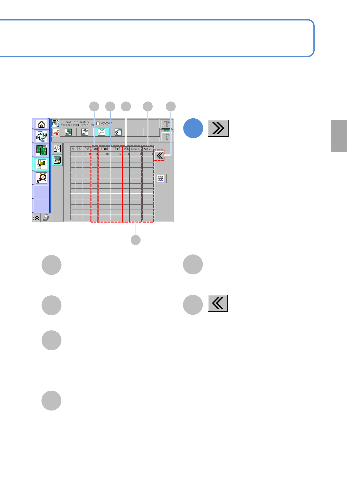 NPM-W 2 EJM7DE-MB-03 O-00 3-2-9 -2 C A B D Returns to the previous screen. X [mm]/Y [mm] The coordinate s on which the error Occurred. E F Tu r n The turn between a fe eder and a PC B when error occurred . PCB The placem…
