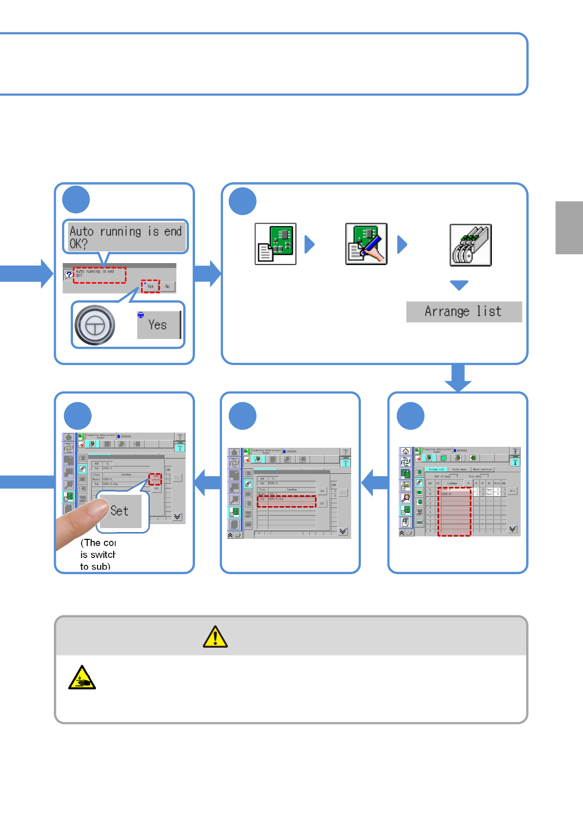NPM-W 2 EJM7DE-MB-03 O-00 3-3-1 -2 3 4 7 6 5 Confirm the message Display the data edit screen (Data edit) Choose the arrangement list from “Feeder/Tray” layer Choose a master component ( → P .6-1-7) Choose a sub componen…