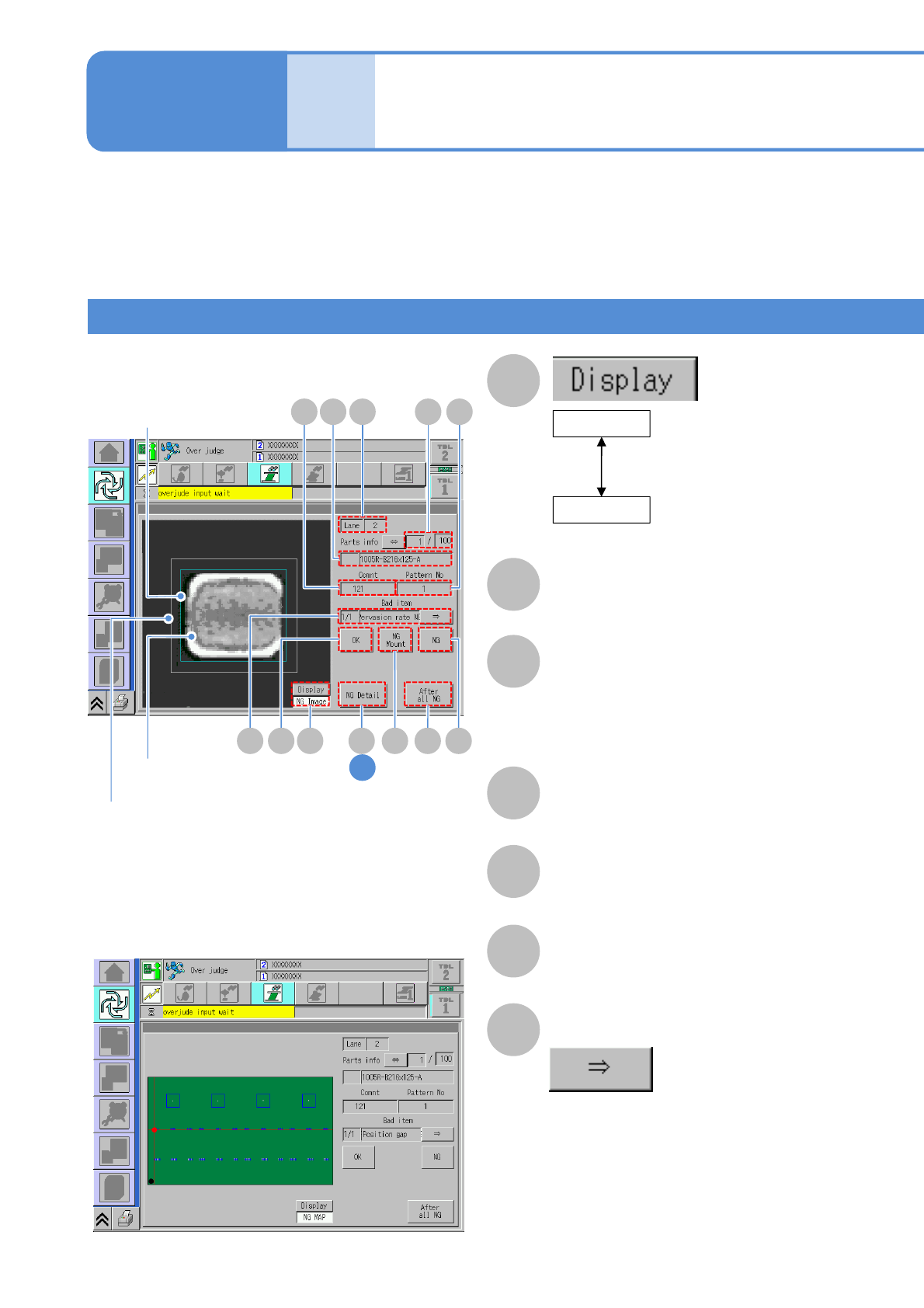 ●Check visually any inspection-NG location displayed on the screen and set it as either nonconforming or