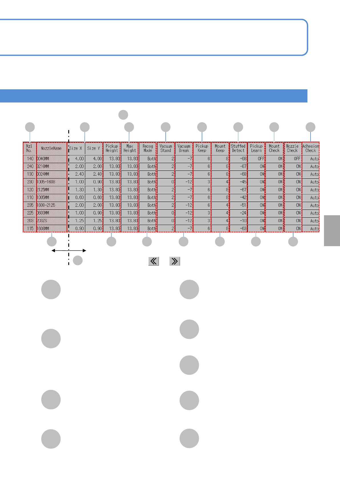 NPM-W 2 EJM7DE-MB-06O-0 0 Data editing Libr ar y c hec k 2 6-1-21 -3 B Ty p e PickupCalX/Y C Set Pitch D FeedV ol E T ape Width F Feeder library B C D E F A A Shows the previous or next table. Offset of a feeder pickup p…