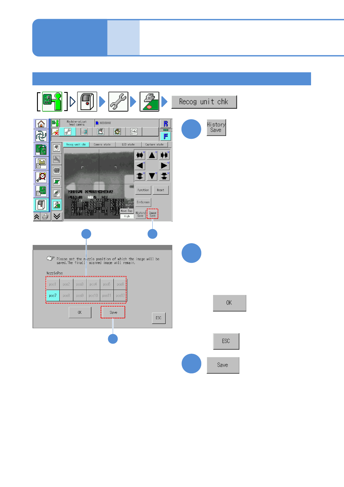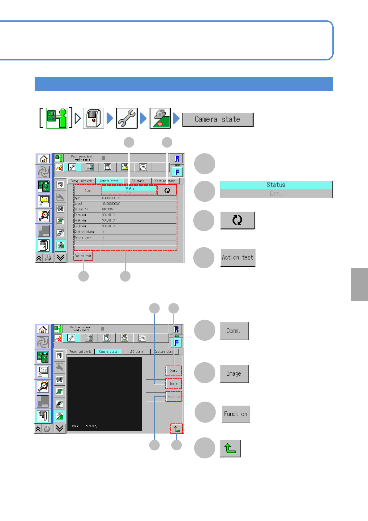 NPM-W 2 EJM7DE-MB-07 O-00 Checking head camera status 7-2-1 1 -4 A B Status and error of each item Updates to the latest information . (The a ction/image test sc reen is displayed) A C B D D C Switches the display type. …