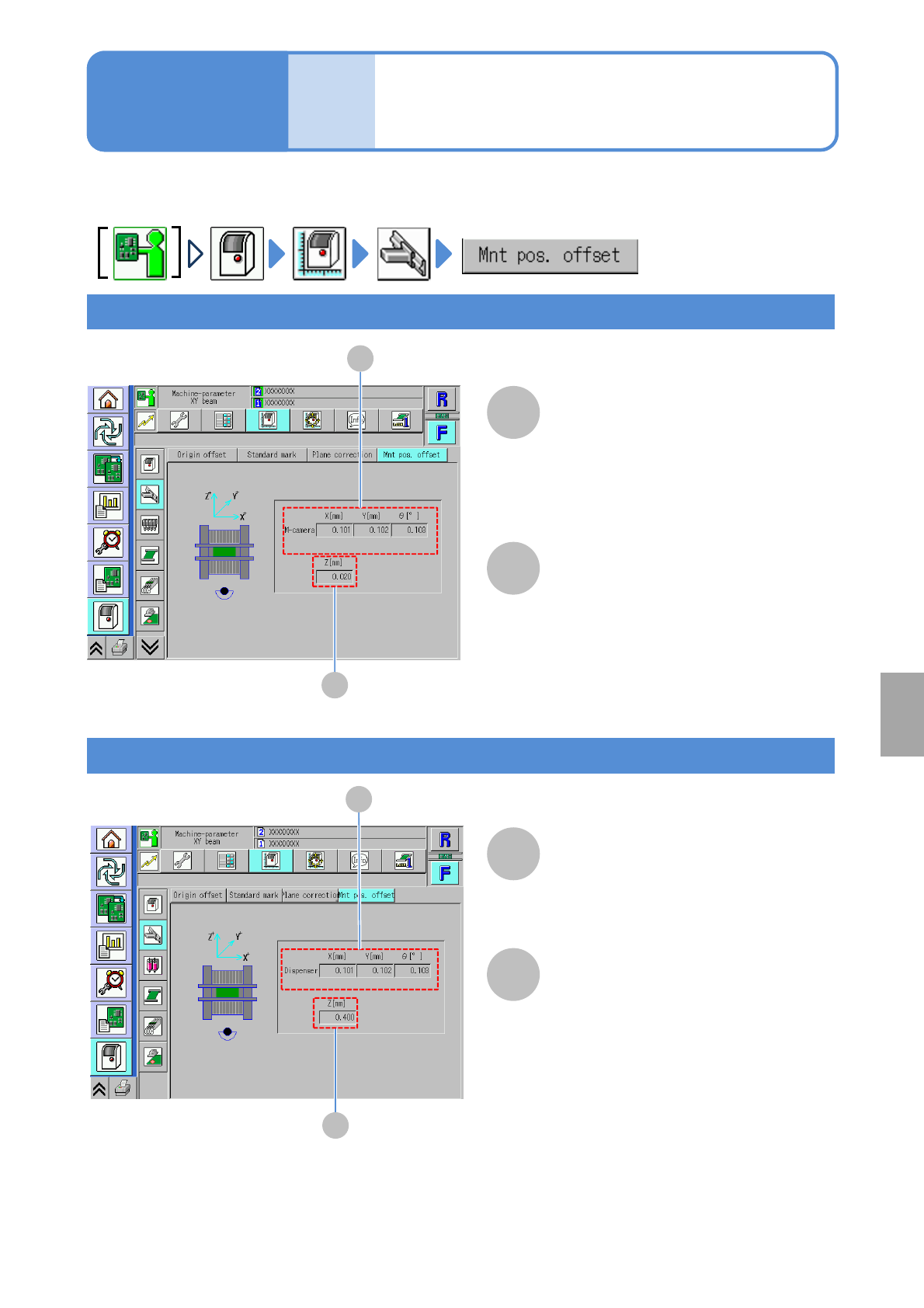 NPM-W 2 EJM7DE-MB-07 O-00 7-3-2 Machine parame- ter Placement position of fset c heck Operating procedure 7-3-2 You can check placement position offset. Multi-recognition camera X[mm]/Y[mm]/ θ [ ° ] Displays X-, Y- and θ…