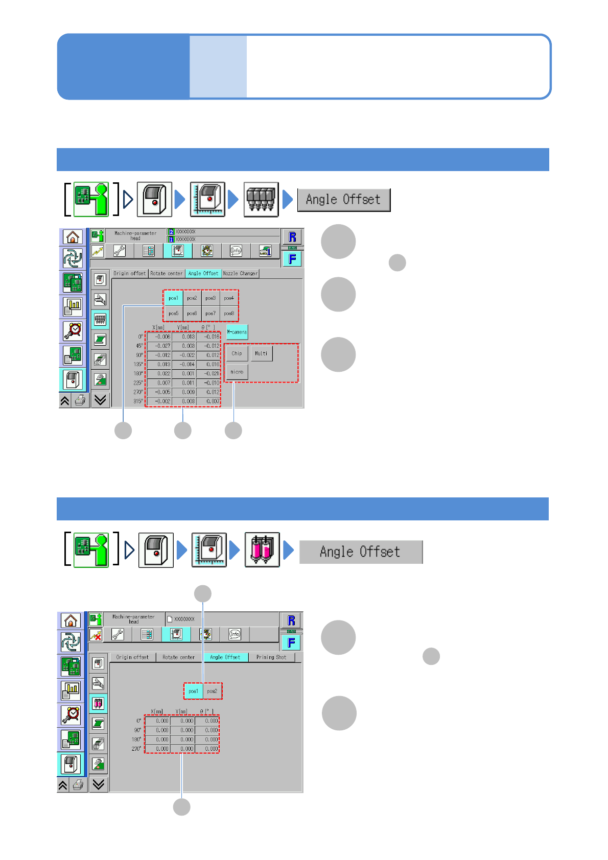 NPM-W 2 EJM7DE-MB-07 O-00 Nozzle position Offset of the selected nozzle is displayed in . 7-3-6 Machine parame- ter B Placement head You can check the X/Y/ θ element offset values (calibrat ion result) per head θ rotatio…