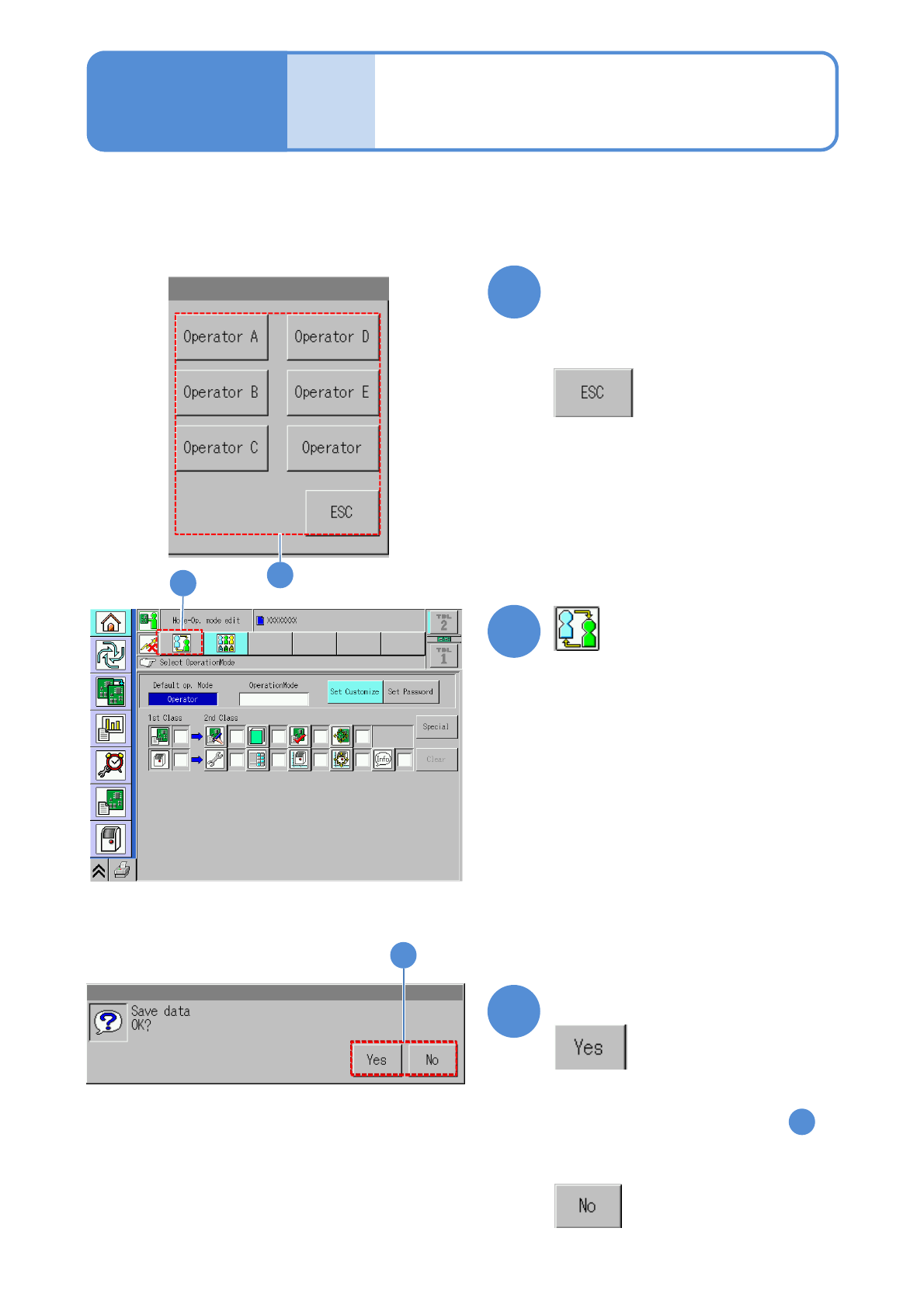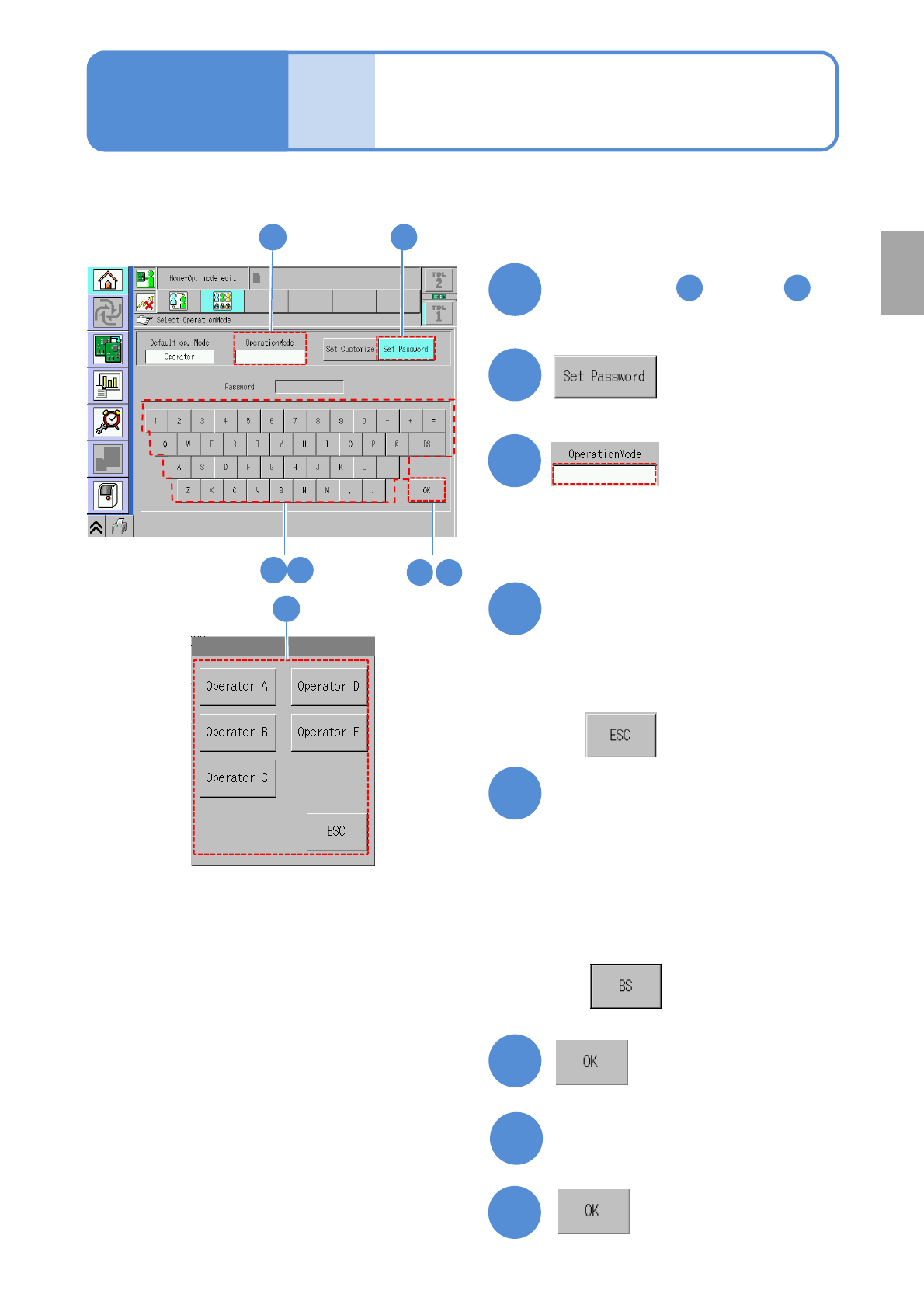 NPM-W 2 EJM7DE-MB-02O-0 0 2-1-4 -1 1 Do the steps through on P .2-1-3 2 2 3 4 ● Set a password to each operation mode. 1 5 3 Touch the blank space 4 Select the operation mode to which you w ant to set a password ■ If you…