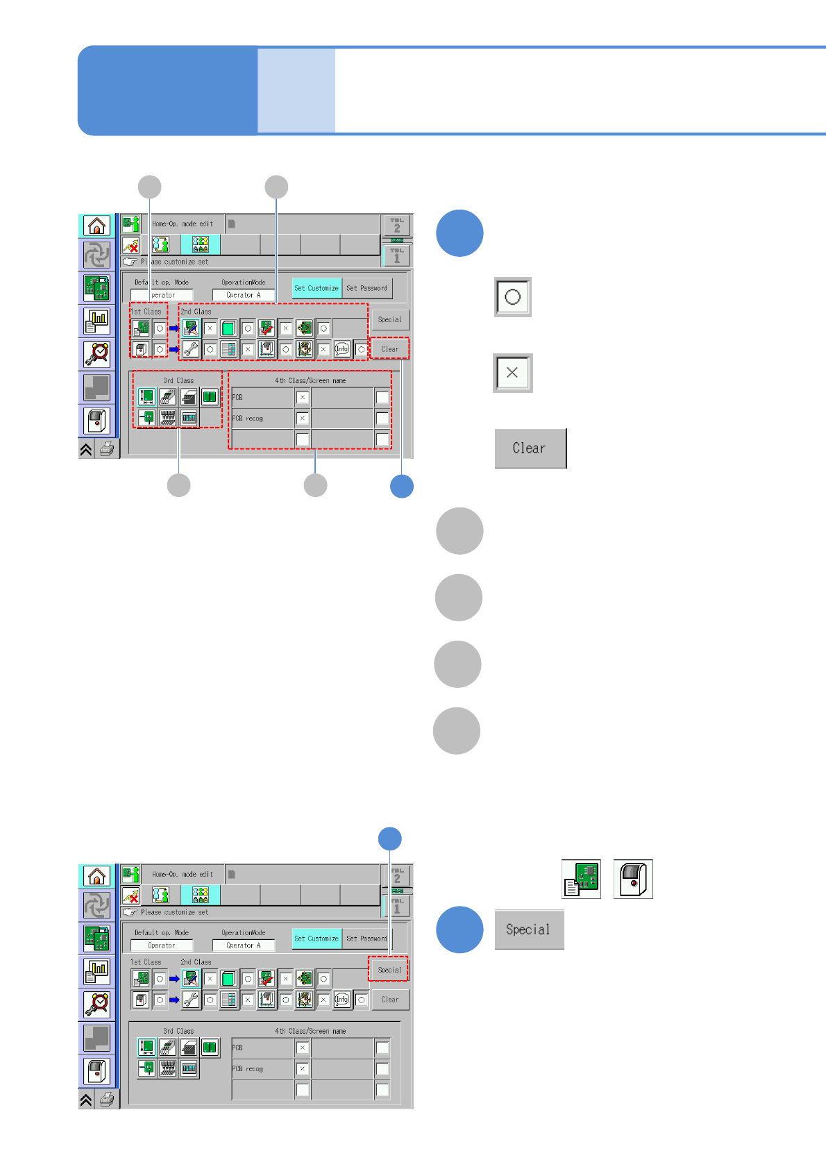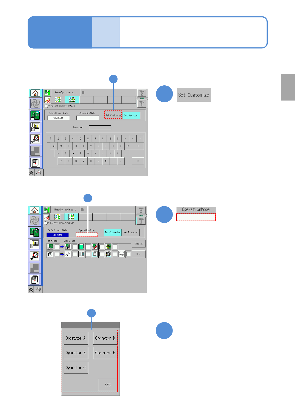 NPM-W 2 EJM7DE-MB-02O-0 0 2-1-5 -1 1 1 ● Set operating auth ority given to the operator. 2 2 Touch the blank space Basic opera- tion Customize setting 1 Operating procedure 2-1-5 3 Select an operator to whom you give ope…