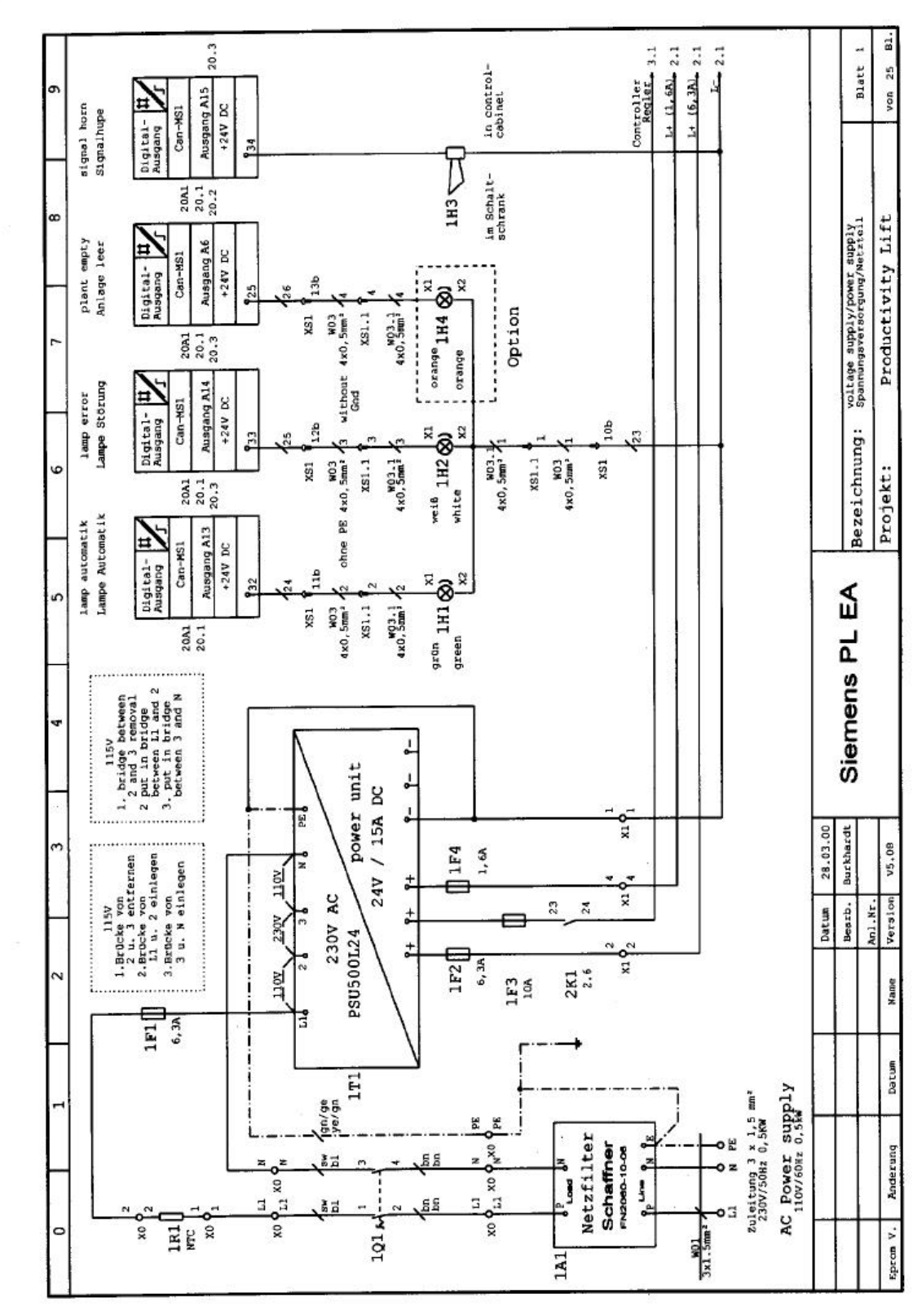 Order No. 00192 169-01 User Manual - Productivity Lift E_SPLFS03_V40_11_0300_200300_V1_14.doc Last update: 20.03.2000 - Version V 1.14 Page 58 13 Appendix A Circuit diagrams