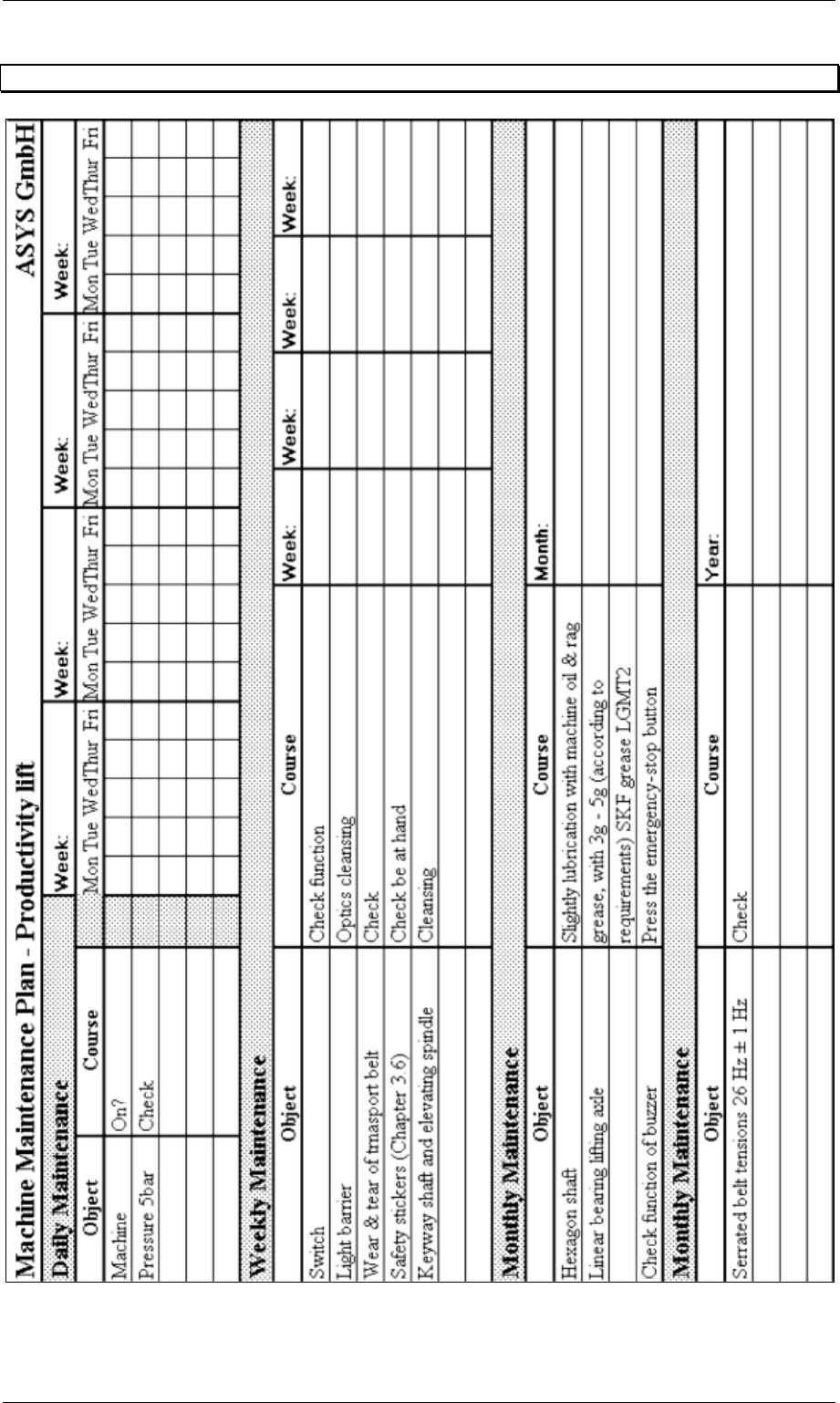 Order No. 00192 169-01 User Manual - Productivity Lift E_SPLFS03_V40_11_0300_200300_V1_14.doc Last update: 20.03.2000 - Version V 1.14 Page 85 18 Appendix F Maintenance plan For maintenance work it is absolutely necessar…