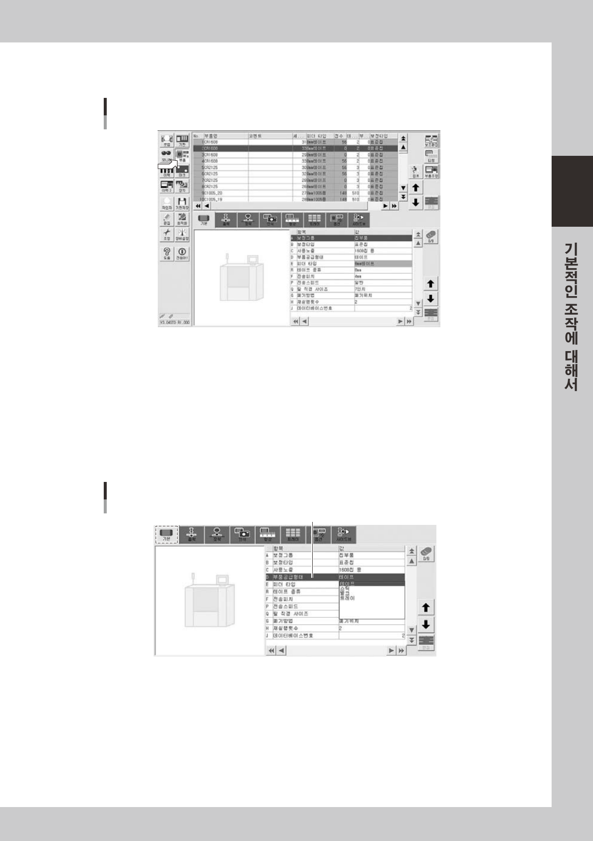 [ 부품 ] 버튼을누르고부품데이터화면을열어서,화면상부의부품리스트에서대상부품을선택합니다.