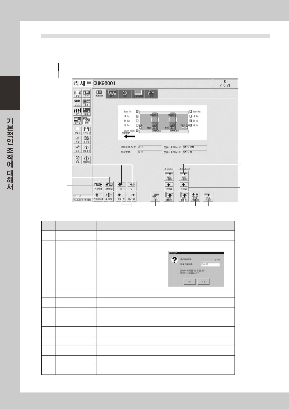 2-14 2 2 .3 장 치화 면 「장치」화면 내의 수 동조작 버튼에 관한 내 용과 기능에 대해서 설 명 합니다 . ■ 컨베 이어 수 동 조작 1 2 3 4 5 6 7 8 9 10 11 12 컨베이어 수동 버튼 2 8 2 0 4 - L1- 0 0 버튼명 기능 1 기판 반 입 입 구또는대기 위 치에서기 판을이동 시켜세 팅위 치에서고 정 합니다 . 2 기판 반 출 기판 고 정 을해제…