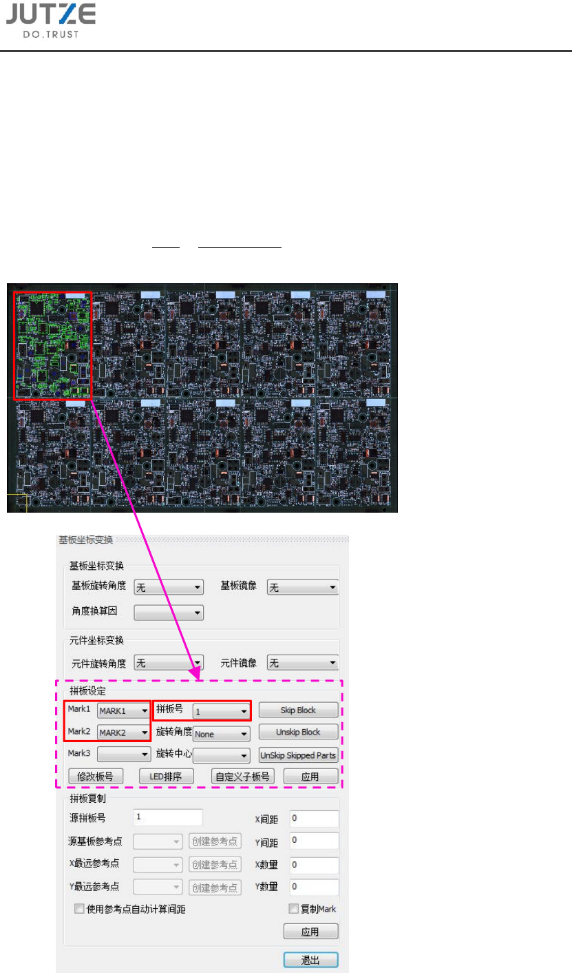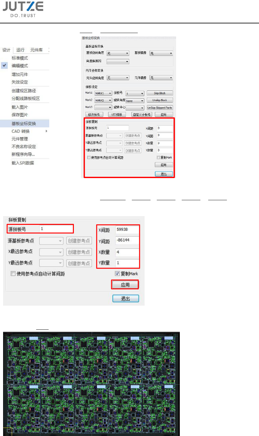 可点击主界面菜单指令栏设计 - 基板坐标变换,在主界面右侧出现基板坐标变换界面中的拼板