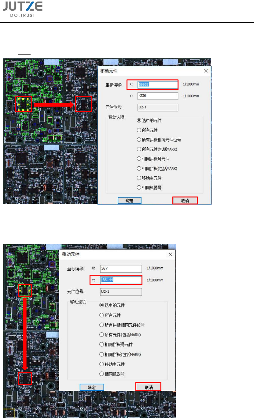 12.2.1 选中源拼板中一颗元件,手动拖动至水平相邻拼板的对应位置,记录下 X 方向数据,然