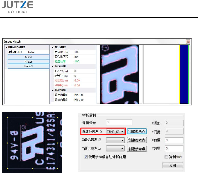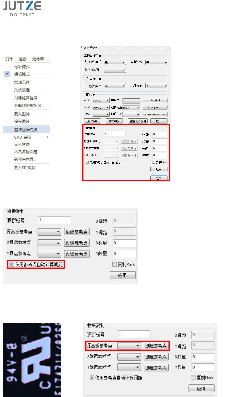 第十二章 拼板复制功能 V 7.0.4584.0-2 www .jutze. com.cn 1 12 / 136 12.3 自动计 算拼板 间距方 式 12.3.1 点击 菜单指令栏设计 - 基板坐标变 换,在主界面 右侧出现基板 坐标变换界面; 12.3.2 在拼 板复制功能区 域,勾选使用 参考点自动计 算间距; 12.3.3 选择 源拼板上特 征明显的标 识点, 随后点击 “源基板参考 点” 后 的创建参考 点, 进入元 件编辑界…