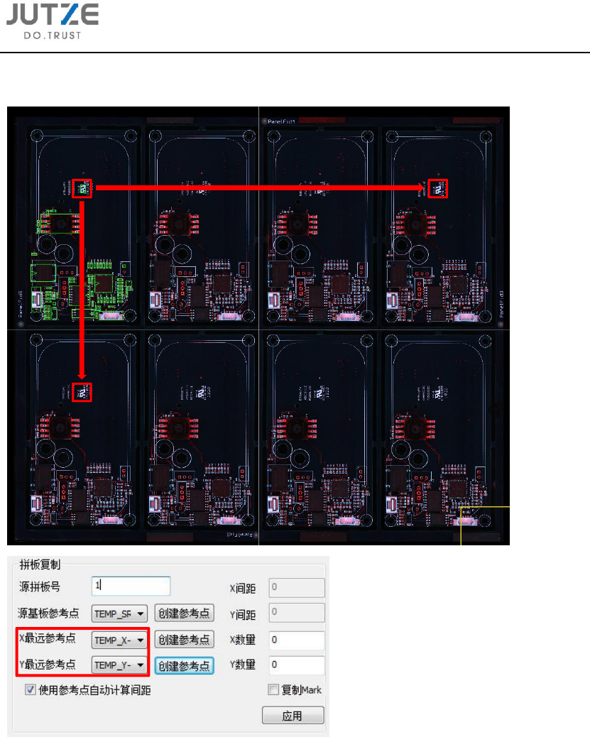 12.3.2 在拼板复制功能区域,勾选使用参考点自动计算间距;