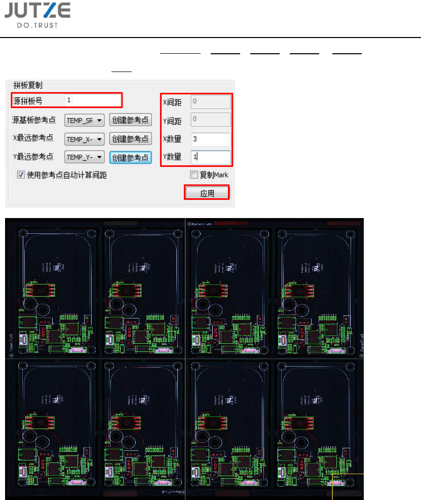 12.3.6 在拼板复制功能区域,填写源拼板号、X 间距、Y 间距、X 数量和 Y 数量(即 X 和 Y