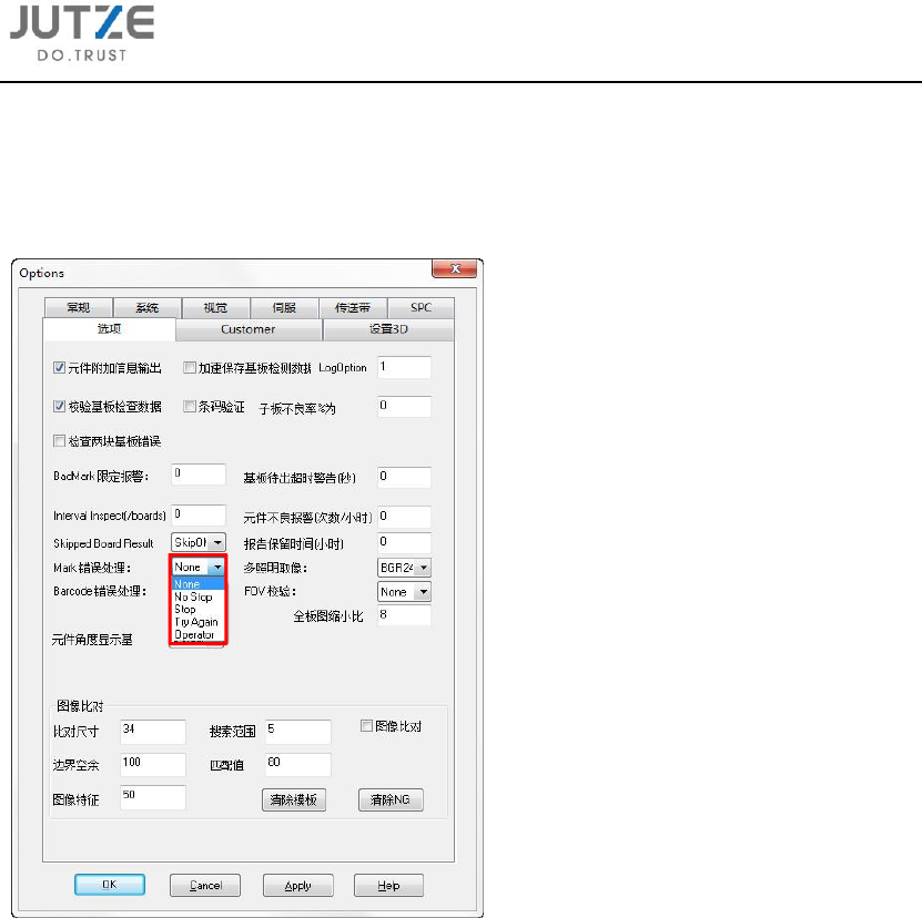 用于确定实际基板和检测程序之间的相互位置关系。当判定 Mark 为 NG 时,会按下图设定做相