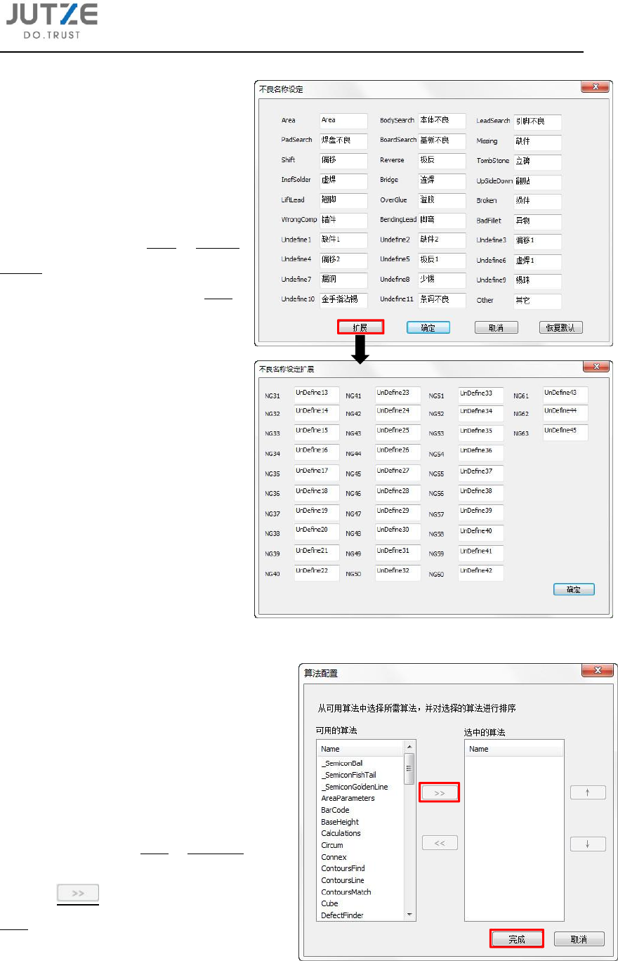 第十四章 软件应用设定的介 绍 V 7.0.4584.0-2 www .jutze. com.cn 126 / 136 14.3 不良名 称设定 14.3.1 作用 用于对 元件编辑界 面中检 测项目 的名称 ( NG 种 类 ) 做自 由 命 名 ,名 称 输 入 支 持数字、字 母、文字。 14.3.2 设定 点 击 主 界 面 菜 单 指 令 栏 设 计 - 不 良 名 称设定 ,进入不良 名称设 定界面 。在该 界面中可自 由命…