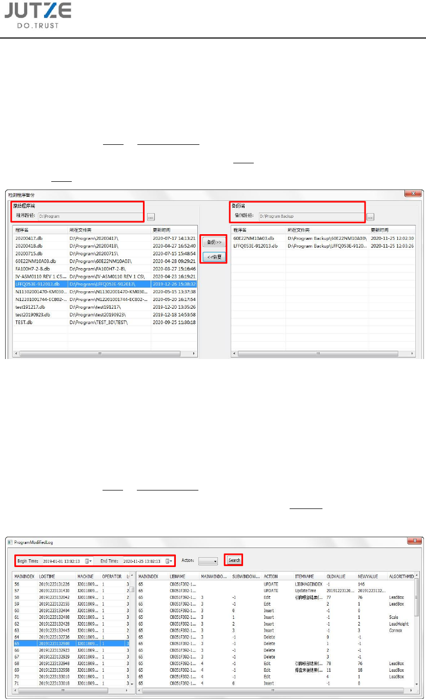 径,可显示该路径下所有检测程序。选中程序,点击备份,即可将程序备份到备份路径下(①)。